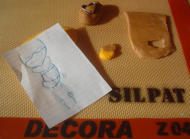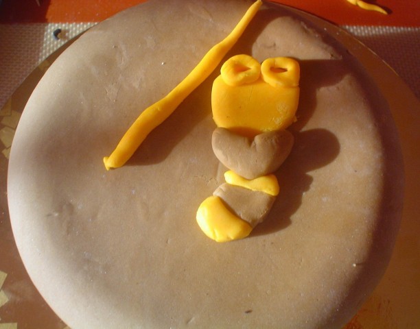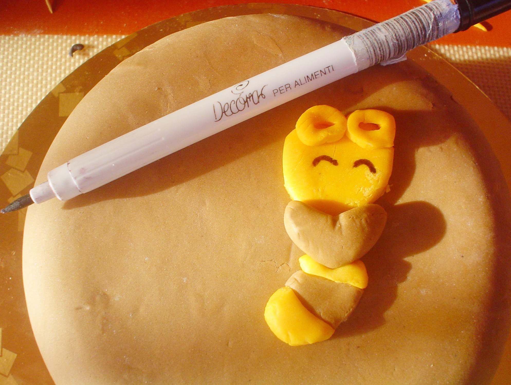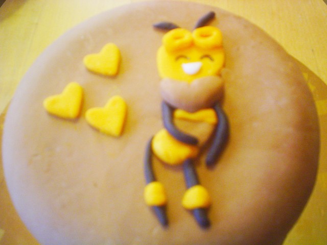 Disegna un’ape. Stendi della glassa fondente gialla e marrone. Poggia il disegno sulla glassa gialla e ripassa i contorni del disegno stesso con una matita (solo i pezzetti gialli). In questo modo, dopo aver sollevato il disegno, vedrai la sagoma dell’ape sulla glassa. Con l’aiuto di un coltello, taglia i “pezzettini” gialli. Ripeti la stessa operazione, con la glassa marrone. Per il “collo” dell’ape utilizza un cutter a cuore.