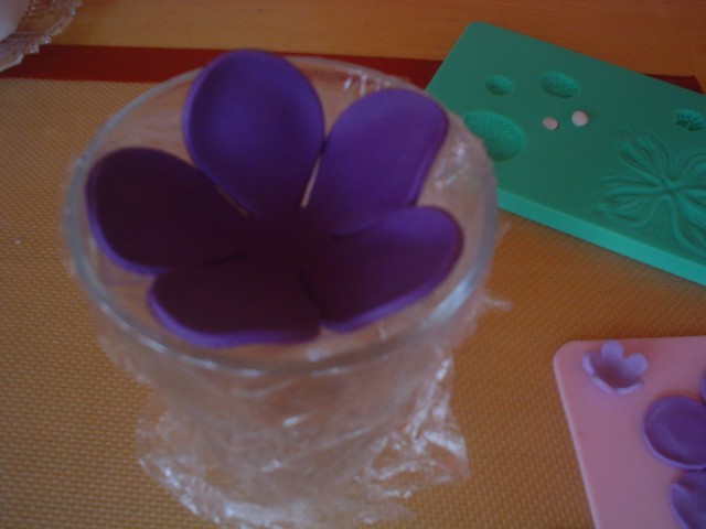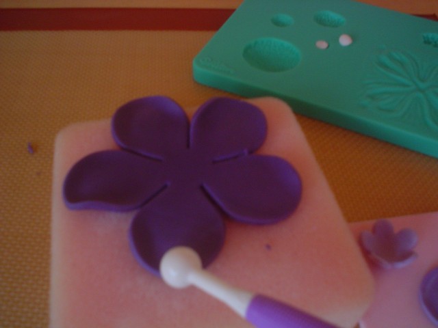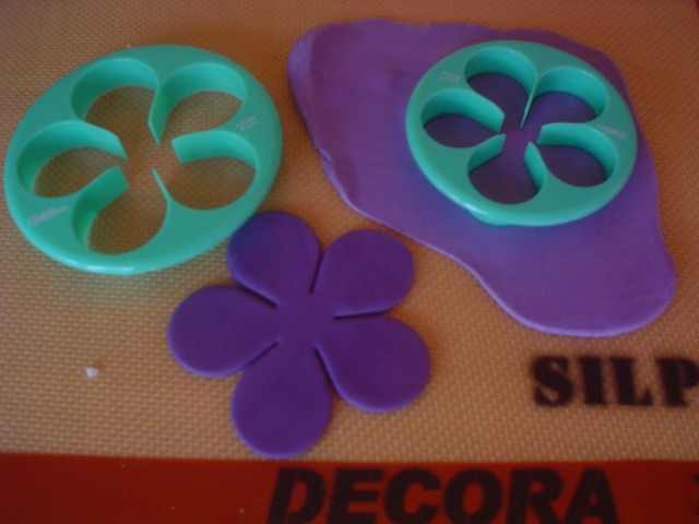 Dopo aver colorato la pasta di gomma (io ho usato due tonalità diverse di viola), stendila con il mattarello e taglia i fiori con i cutter.