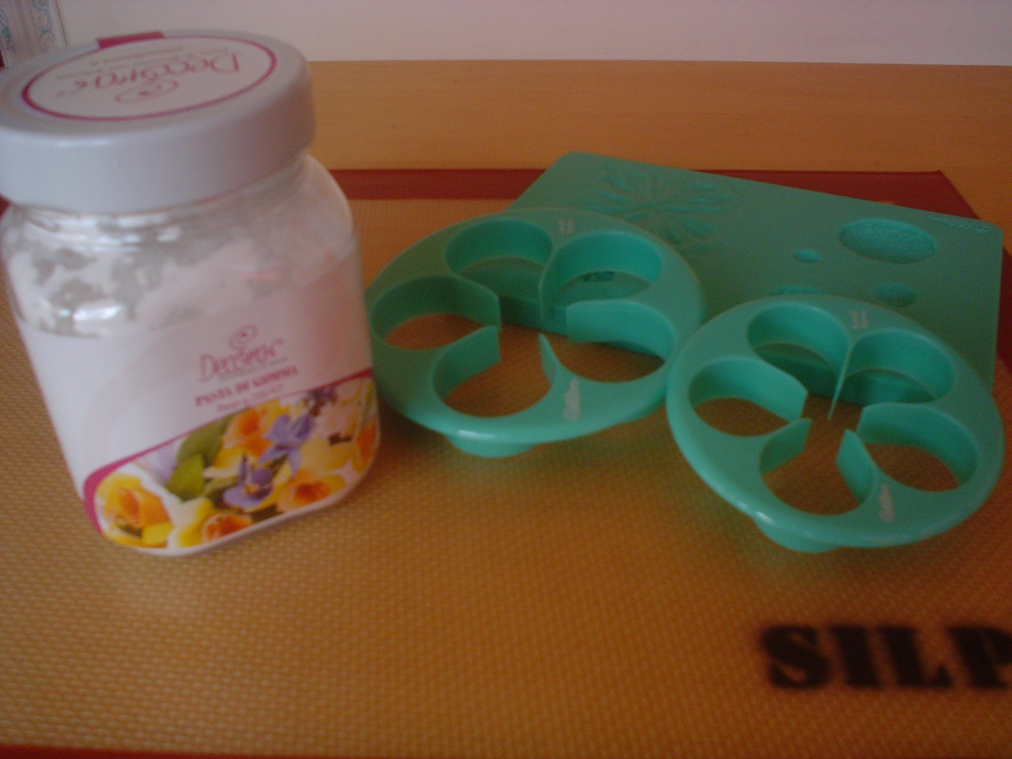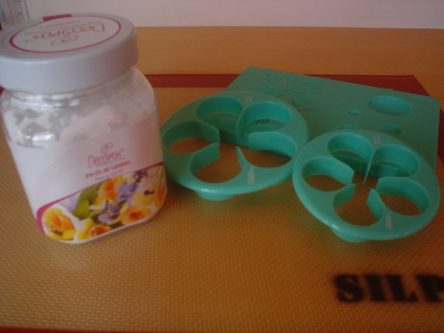 Per i fiori ho utilizzato la nuova pasta di gomma della Decora. E’ un mix in polvere al quale basta aggiungere dell’acqua (come scritto nelle istruzioni), per ottenere un’ottma pasta elastica e modellabile. Per sagomare i fiori, ho utilizzato dei cutter a 5 petali della wilton, di misure diverse.