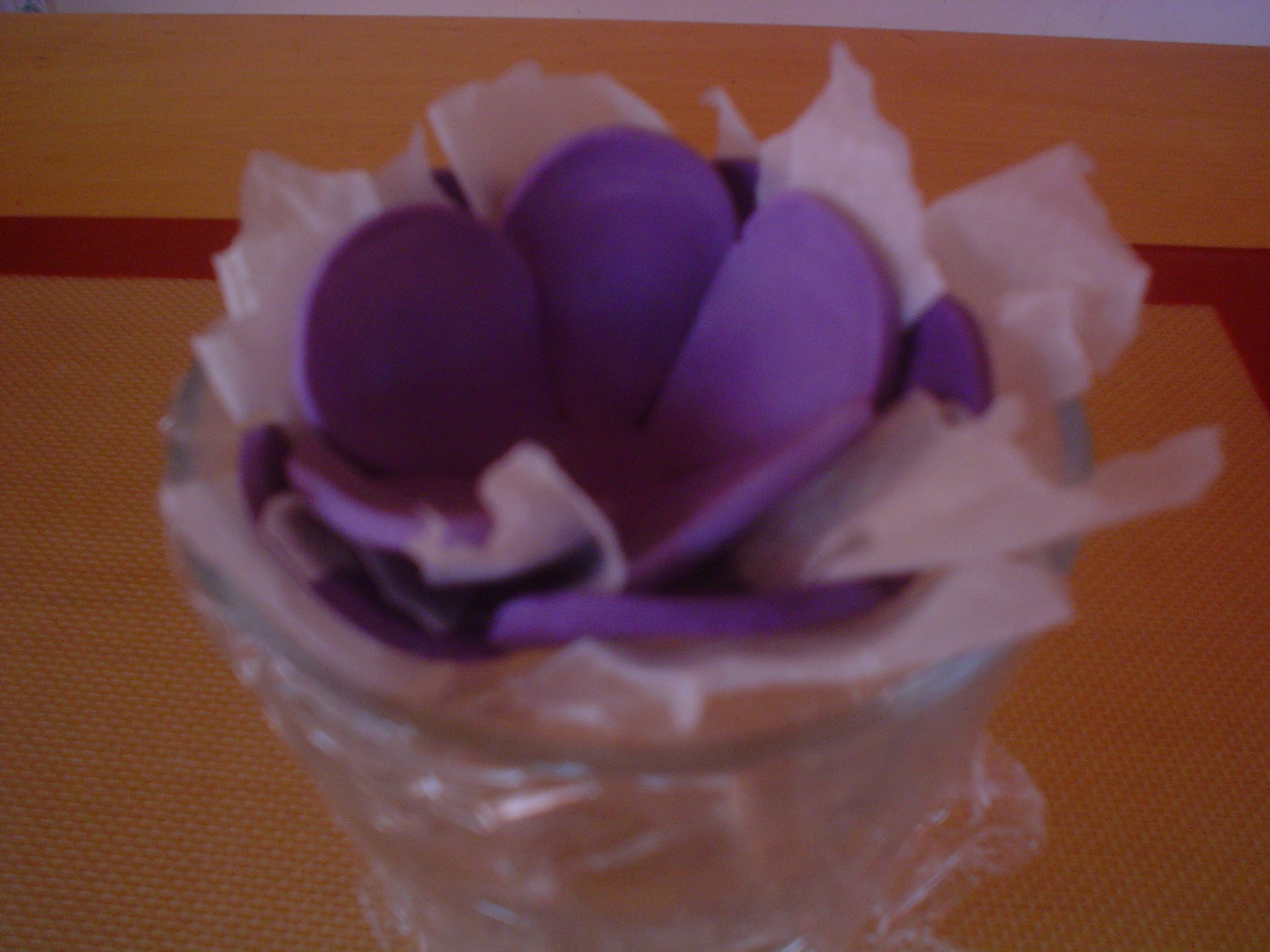 Sovrapponi il secondo fiore “incollandolo” al primo con una goccia d’acqua. Solleva i petali con della cartaforno, affinchè anche questi possano asciugarsi verso l’alto.