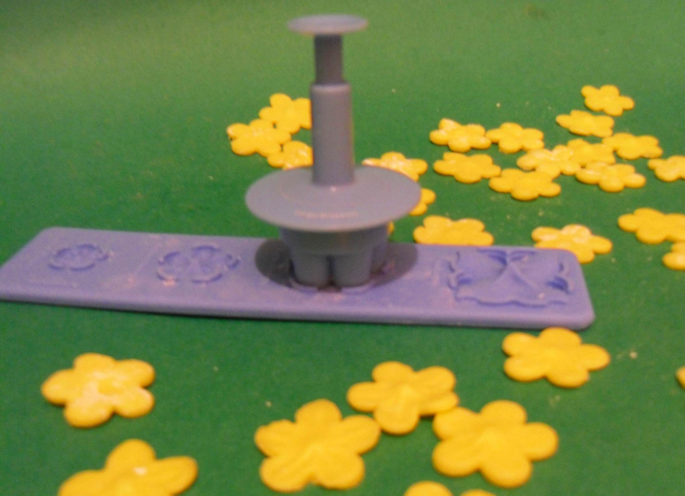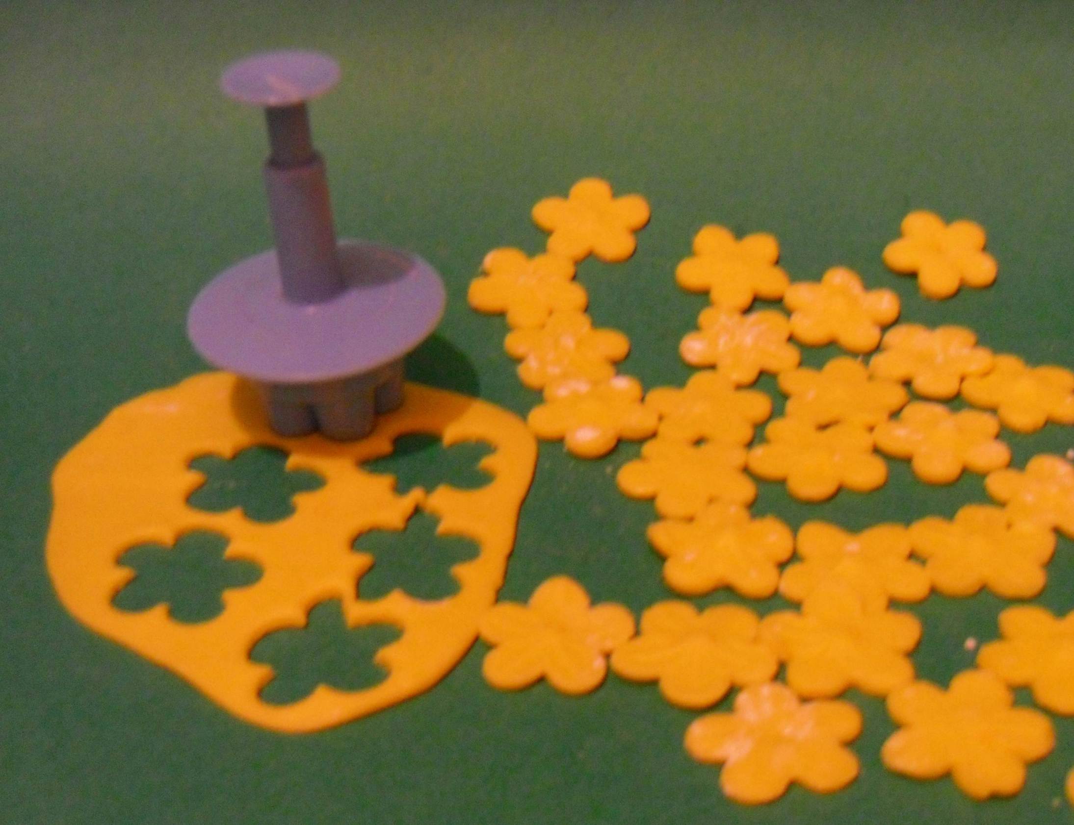Stendi della glassa fondente e taglia tanti fiori. Io ho usato il cutter combinato con l’espulsore, ma in realtà va bene anche il cutter semplice del pongo. Per questa torta, non è indispensabile l’attrezzatura specifica. L’unica cosa indispensabile è la pazienza!