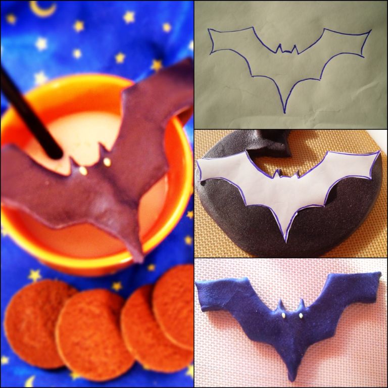 Disegna un pipistrello su un foglio di carta forno. Taglia il disegno. Stendi della glassa fondente nera alta 3 o 4 mm. Adagia il disegno di carta forno sulla glassa e scontorna il pipistrello con un coltello (seguendo il disegno). Applica due piccole palline schiacciate, per ottenere gli occhi. Fai asciugare per qualche ora. Appena la glassa si sarà indurita, il pipistrello sarà pronto per svolazzare sulla nostra colazione!
