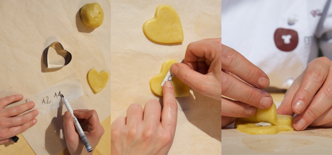 Con il cutter a forma di cuore, taglia due biscotti. Scrivi i numeri “fortunati” su un piccolo rettangolo di carta forno (io ho preferito usare un pennarello alimentare). Ripiega il rettangolo su se stesso, in modo che il lato su cui hai scritto, sia interno. Disponi il bigliettino nella parte superiore del biscotto. Ricopri con l’altro cuore.