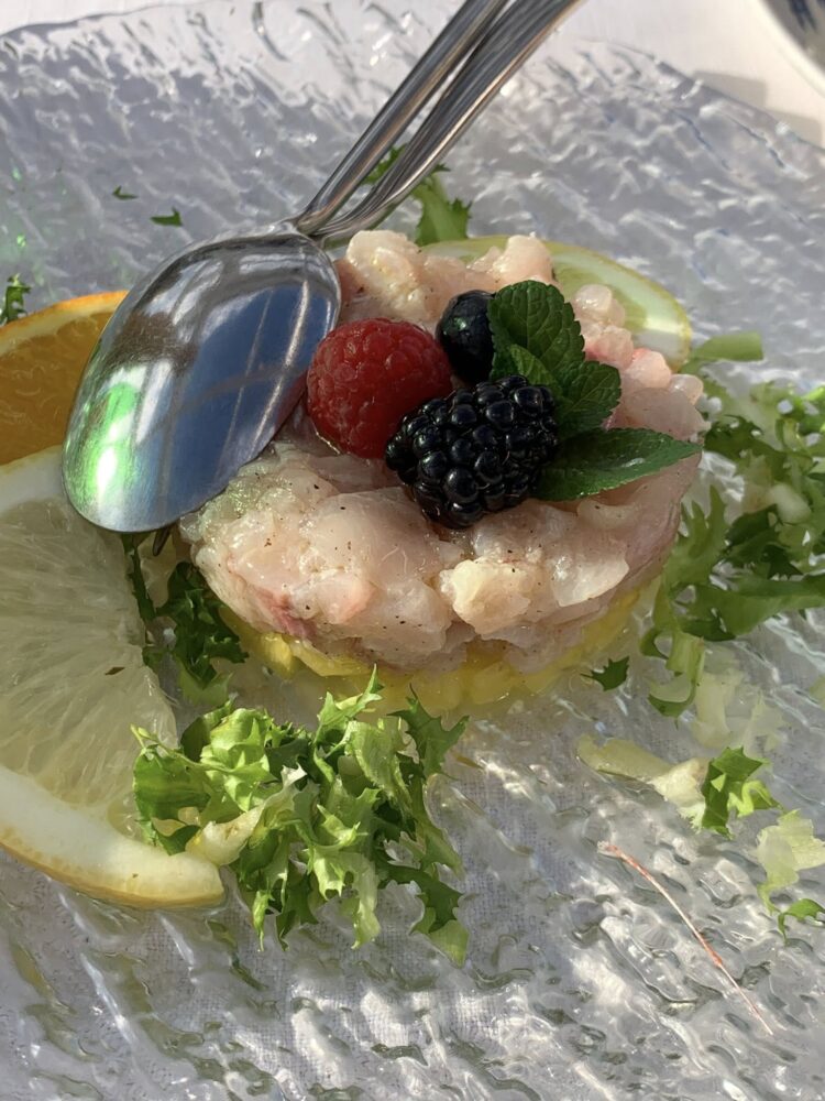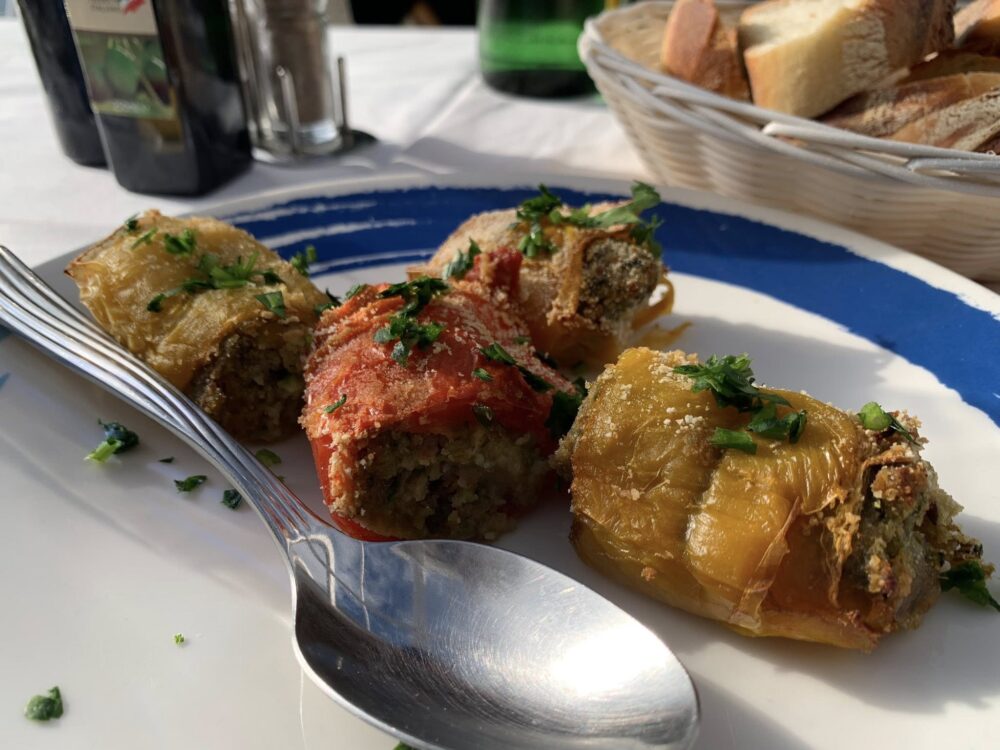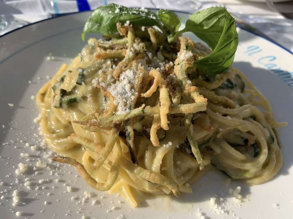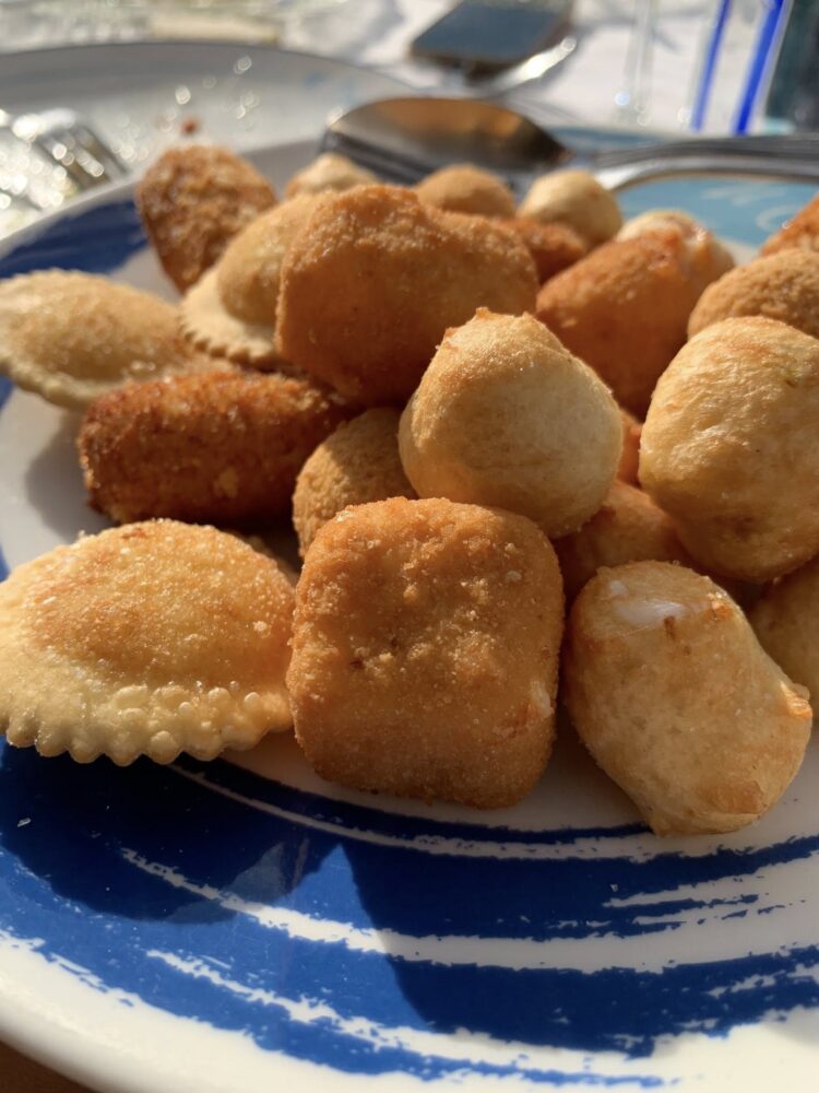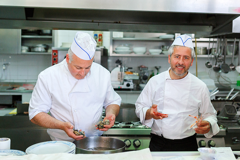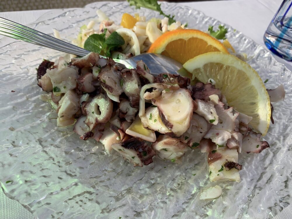 Il servizio perfetto, la cucina organizzata e veloce non lascia tanto tempo all’attesa, ogni vostro desiderio e ordine. Il servizio è veloce ma nessuno vi porta fretta quando avete finito, i tavoli girano solo se i clienti decidono di alzarsi dopo aver “pariato” tutto di cui hanno bisogno. Ed è proprio la gestioendel tempo che fa la differenza tra la filosofia dello stare a tavola italiano dal resto del mondo: la convivialità è essa stessa un ingrediente, quello principale, perché in questi posti non si viene per fare o, per dirla alla gastrofighetto, per “fare una esperienza”: l’esperienza è la strada che ti porta, la barca con cui sei approdato, gli olivi secolari che ti abbracciano quando lasci Sant’Agata e ti abbracciano lungo tutto il percorso, la spiaggia sassolata, le rocce emerse che diventano protagoniste quando il tempo è cattivo, il sole e il cielo azzurro, azzuro, azzurro.