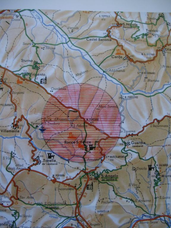 Siamo ancora nel comune di Torella dei Lombardi, scendendo verso l’imbocco della stradina che ci porterà nella parte alta della Valle Dell’Ansanto dove Virgilio aveva ubicato uno dei due ingressi per gli Inferi, l’altro era Pozzuoli. E già avvertiamo al naso l’effluvio solfureo che proviene dalla vicina Mefite. Le esalazioni trasportate dal vento, condizionano e non poco il paesaggio circostante, che si presenta ai nostri occhi con una sfumatura cromatica giallognola, tipica dei composti dello zolfo. Un’altalena di salite e discese pari quasi alle montagne russe, alla fine ci fa puntare decisamente verso l’alto della contrada Montanaldo, collocata a mezzo tra Rocca S. Felice e Sant’Angelo dei Lombardi. Ci siamo!!!