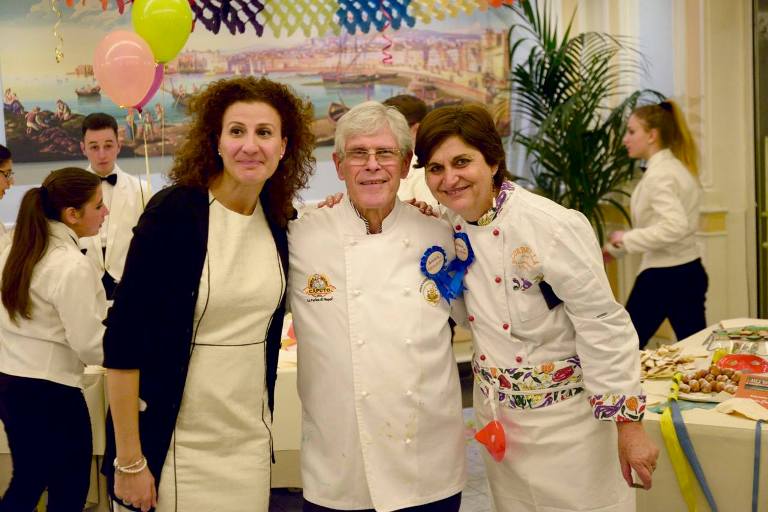 Sabatino Sirica ha fatto assaggiare le chiacchiere, le castagnole ripiene di crema e inzuppate leggermente in uno sciroppo al rhum e le Santarosa.
