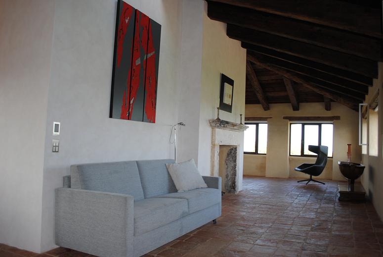Nel sottotetto trovo le stanze una volta destinate alla servitù ed il granaio, riconvertito in una superior suite di 120mq con 18 finestre e vista a 360° sulla Majella, sui giardini, i boschi, gli uliveti ed i vigneti. Siamo anni luce lontani dai frastuoni, siamo vicini al nevoso bianco della Majella, alle acque chiare dell’Adriatico.
