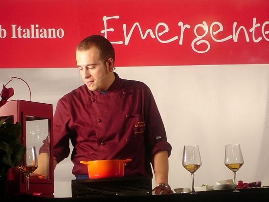 E’ il resident chef della manifestazione, tocca a lui accendere i fornelli, cosa non semplice ma se la cava bene nel suo ruolo, quello di presentare un piccolo campionario di prodotti e ricette derivanti dal proprio territorio, bravo a promuovere la zona dove opera e a non andare a cercare estetismi e virtuosismi. Messaggio ricevuto.