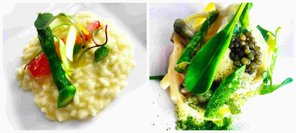 Elaborati nel gusto e nella teatralità estetica in linea con l’idea di servizio 2.0. Triglie di scoglio, Pomodoro, Zenzero & Limone. Tataki di Tonno, Sesamo, Ostriche & Foie Gras Torchon. Crudo di Gamberi Rossi, Colatura, Miele, Peperoncino & Estratto di Sedano & Gin. Il minimo comune denominatore è la precisione, precisione che si traduce in finezza e pulizia.