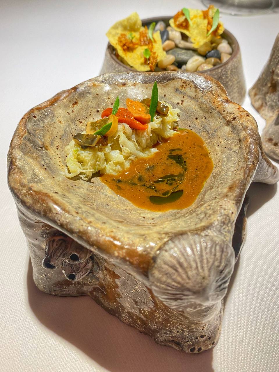 Servito in un piatto che rappresenta uno scoglio della Costiera Amalfitana e composto con un battuto di quanto si può trovare in prossimità di una roccia marina: granchio, ricci di mare, patelle. Completato da una salsa al curry giallo e chips di riso al curry e salsa Xo. Le spezie dell’india unite al gusto più amato di Hong Kong: la salsa Xo.