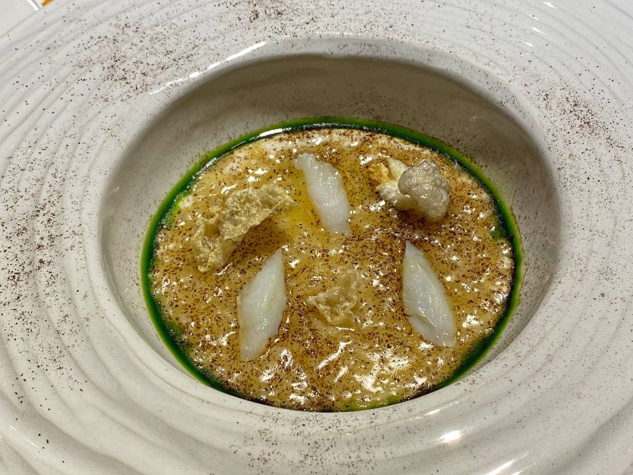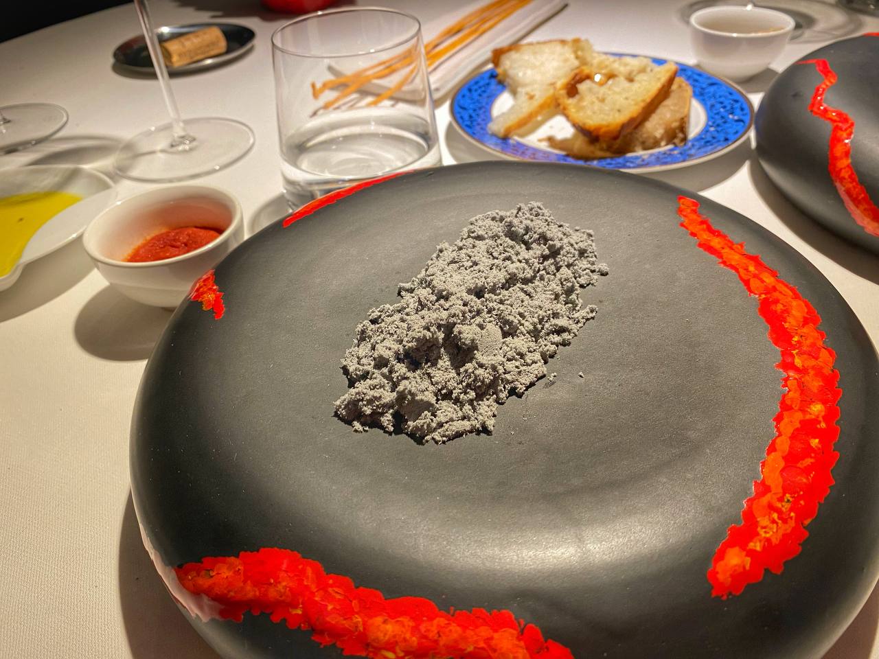 Piatto estremo, la ricciola ha una consistenza ferma e ricca di succhi. Ricorda un po’ la carne. Accompagnato da carie tipologie di limone: fermentato, salato, nero e finita con emulsione di limone di mare e clorofilla di finocchietto marino.