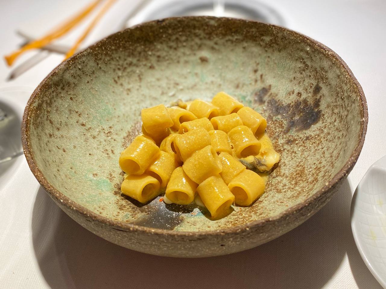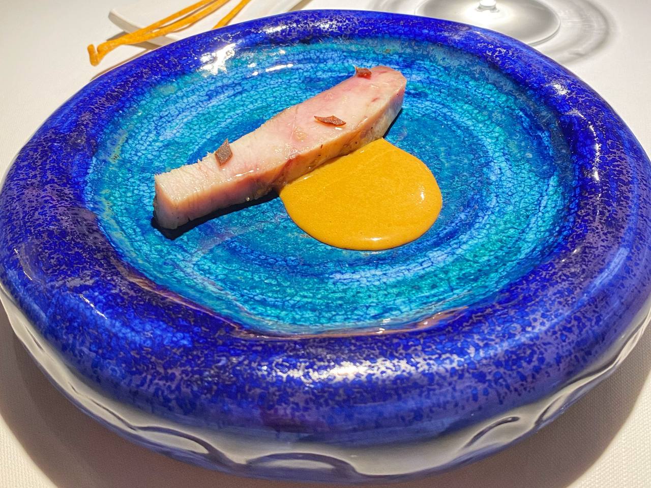 Ventresca di ricciola con 21 giorni di maturazione, leggermente grigliata, bottarga di ricci di mare ed emulsione di ricci