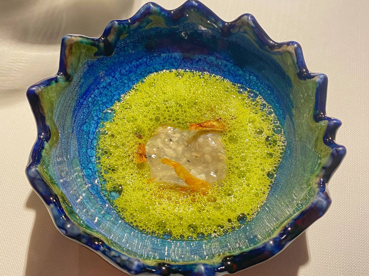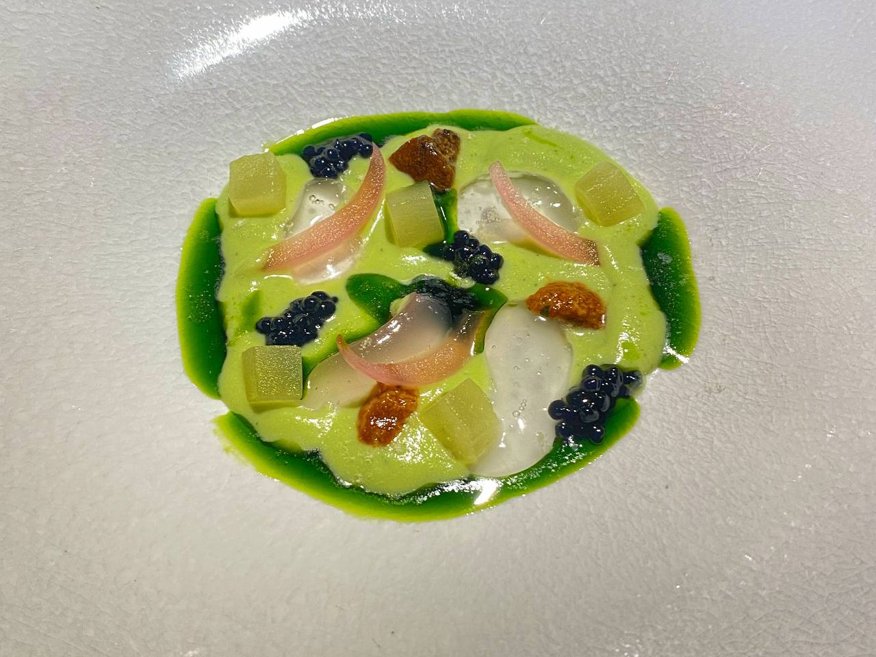 Medusa, con beurre blanc al wasabi, cetriolo al sedano fermentato, ricci di mare, caviale arrosto, clorofilla di basilico.
