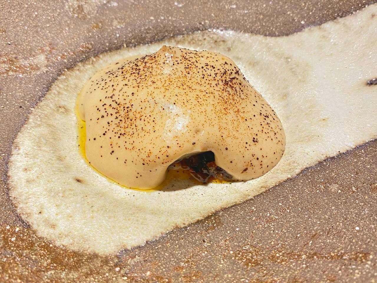 - alla base un’emulsione di quinto quarto di agnello che viene marinato e trattato come se fosse un foie gras e che vede come ingrediente base il cervello di agnello. Il fungo riproduce la consistenza della carne ed è un esempio dei paitti che compongono il menu vegetale (non vegetariano). Un percorso composto da portate in cui l’elemento principale e la salsa di accompagnamento deriva dal mondo animale. Un’inversione, rispetto alla cucina classica, degli elementi che compongono il piatto.