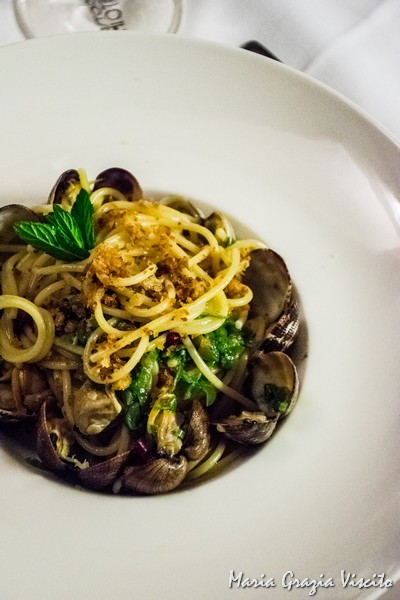 Spaghetti con vongole, peperone verde e mollichella fritta: c’è poco da dire, un tripudio. Ecco come ti presento in forma diversa un piatto che più tradizionale non si può e non ti faccio rimpiangere nulla. Anzi. Buono e il profumo dei peperoni verdi lo si sentiva a distanza.