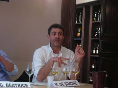 Sandro Lonardo, produttore dell’azienda Contrade di Taurasi, ha il merito di aver intuito le grandi capacità espressive del greco musc’ e di essere riuscito quindi a condurre studi approfonditi sull’uva e sulla sua vinificazione. Veramente la grande intuizione è arrivata parallelamente alla collaborazione con l’enologo Maurizio De Simone, anch’egli presente all’incontro, il quale aveva notato con grande interesse che quest’uva durante la fermentazione si comporta in maniera piuttosto anomala, il suo mosto presenta caratteristiche più simili a quelle di un’uva nera che a quelle di un’uva bianca. Ovvero possiede grande concentrazioni di catechine e polifenoli che è in grado di sostenere pienamente senza produrre grandi ossidazioni, presenta poi una notevole concentrazione poiché l’uva non rilascia più del 50% in materia liquida durante la premitura e l’estratto secco non scende mai al di sotto del 21%.