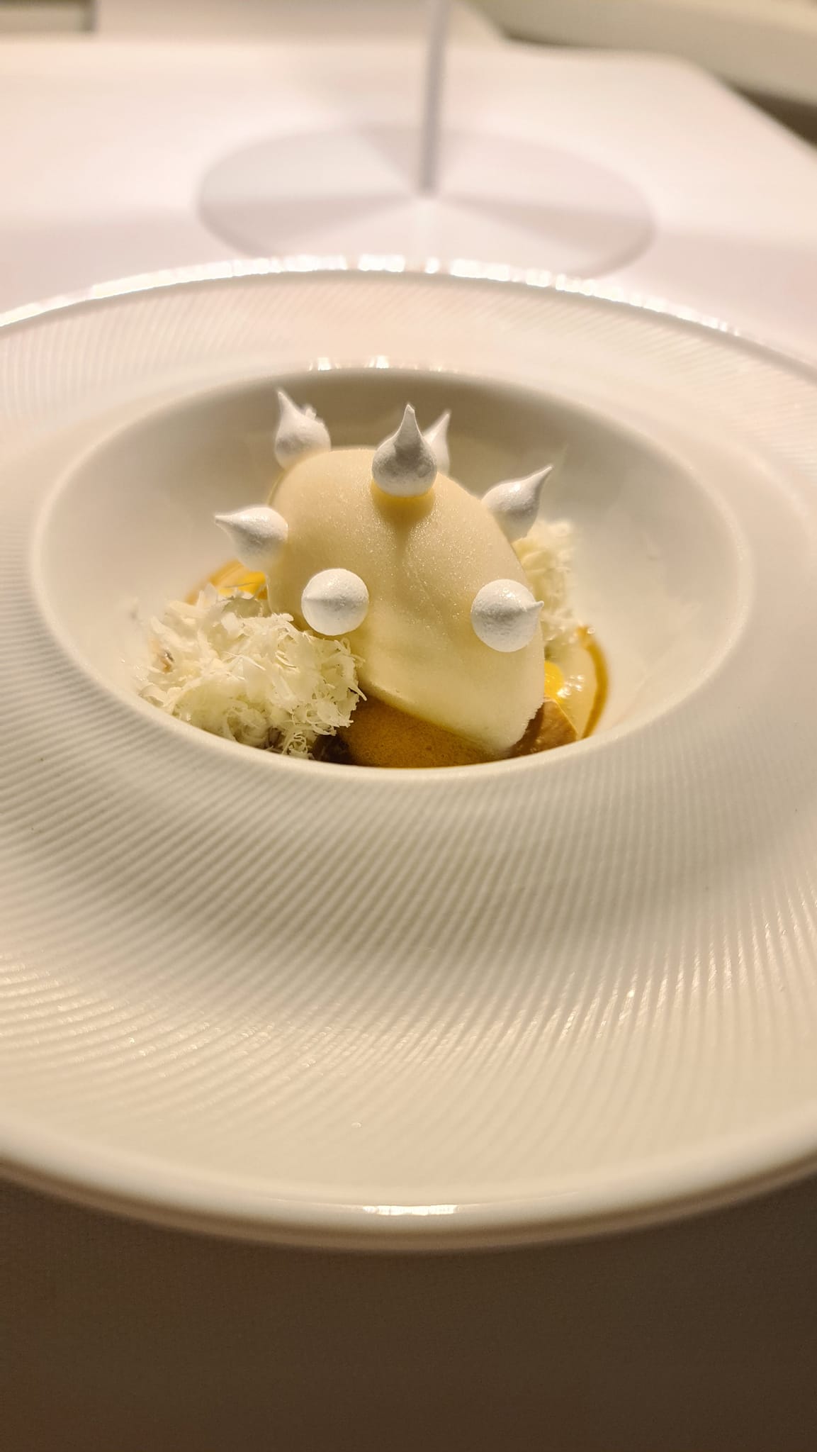- Sorbetto di mucillagine di cabossa di cacao, con ananas, mango e caffè