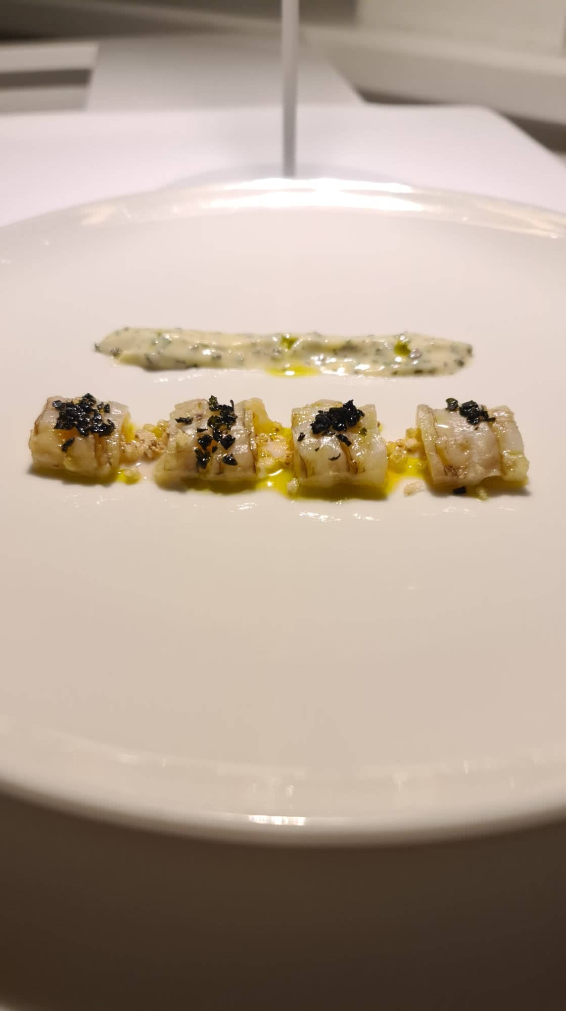 Seppie crude, pomodoro verde, polline, olive nere essiccate: le seppioline vero ingrediente feticcio da queste parti, sono una piccola scala di sensazioni amaricanti. Per questo piatto la scala più famosa di tutte, Stairway to Heaven dei Led Zeppelin. Il paradiso è più interessante con un pizzico di amaro.