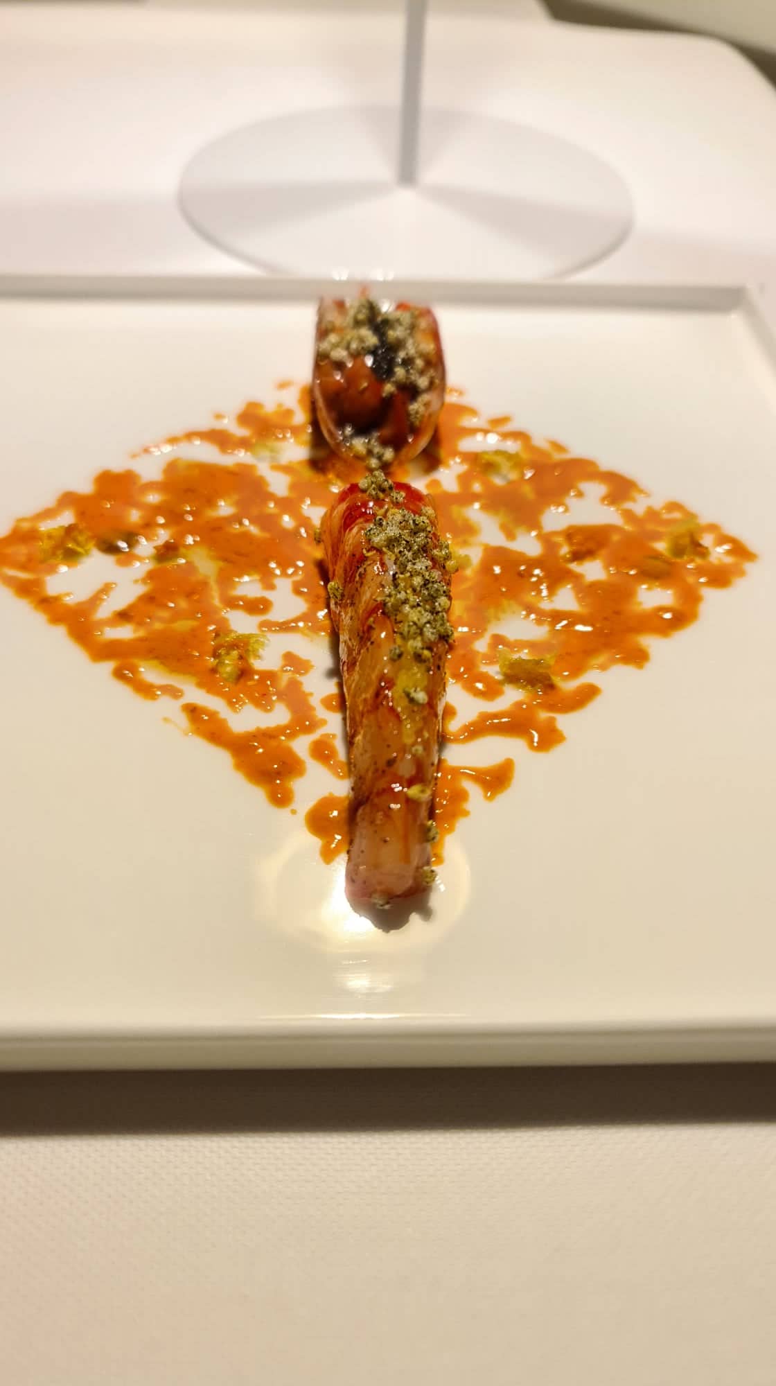 - Gambero rosso, buccia di limone, zenzero, cervello di gambero e cannella