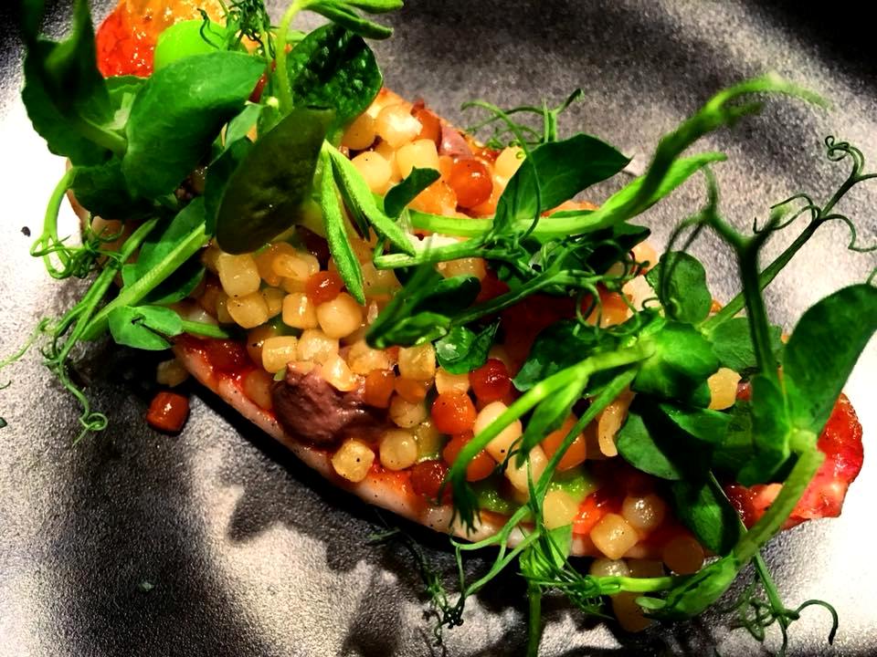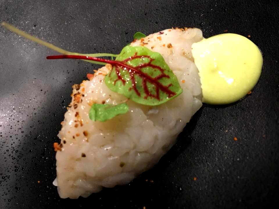 Una cucina P.O.P. nelle forme e nei prezzi. Altamente soddisfacente dal punto di vista gustativo. Una cifra gastronomica coinvolgente senza banalizzarsi in prevaricazione filosofica. Andrea Dolciotti è uno chef filologicamente aderente alla tradizione, che sia la nostra o quella di un altro paese. Uno chef che non disdegna tornare alle origini. Baccalà Godus Morua, Ceci & Cipolla Croccante. Piatto ben strutturato, solido, semplice ma di gran sapore. La sapidità della crema farinosa è ben calibrata, il Baccalà è sfogliatissimo e le cipolle croccanti sono un quid in più. Difficilmente criticabile il crudo di calamaro con mayo al wasabi. Ben eseguito, il crumble tiene gli elementi insieme a dovere. Due poli opposti. Entrambi esempi di una cucina di mare votata all’essenzialità, al rispetto per le materie prime e alla scelta di una direttrice che intercetta pochi ingredienti, filosofia derivante dalle influenze del sol levante. Andrea Dolciotti soprattutto sul Baccalà è riuscito a costruire un retro-morso affumicato molto interessante.