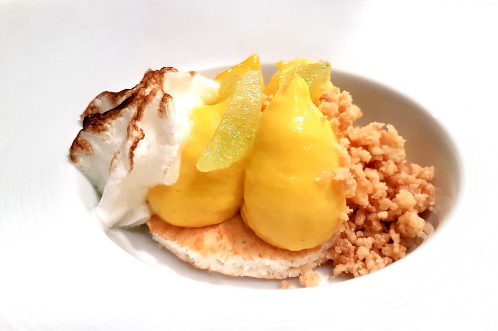 Ricordi d’Inghilterra nel Lemon Curd. La crema inglese al burro e limone di stampo britannico pulisce e sgrassa a dovere. Divertente la meringa all’italiana fiammeggiata. Recupero di quelle cotture primal che tanto ci piacciono di Andrea Dolciotti. Vorremmo sicuramente vedere da lui delle interpretazioni finalmente convincenti di piatti quasi sempre stonati quali la Carbonara di Mare o una Cacio e Pepe di Mare. Andrea è uno dei pochi ad avere le capacità per mettere in piedi filosoficamente una versione convincente.
