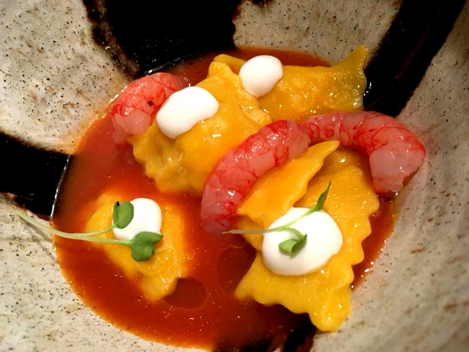 L’approccio verso la materia prima è di impronta giapponese, il pesce è trattato senza scarti. Andrea Dolciotti è fautore in Russia come a Roma di un’etica del riciclo che non ha pari. Le cotture sulla materia prima di mare o sono intense o sono brevi e ragionatamente aggressive. Non ci sono linee direttrici di ingredienti. Tutto può essere complementare, a patto che lo sia veramente. Ritornare a breve distanza per me è stata un’occasione. Un’occasione di confronto e di raffronto. Una cucina mai ipocrita, sempre personale, non assoggettata al servilismo dei cataloghi. Tutto è gestito in prima persona dallo chef, così come le variazioni delle pietanze. I classici rimangono classici ed ecco che i Plin diventano di Gambero Rosso, con la loro bisque. Gambero dentro e fuori. Un piatto delicato e carnoso al contempo. Le due declinazioni del Gambero Rosso di Mazara del Vallo sono assolutamente complanari. La bisque è l’elemento che lega tutto insieme.
