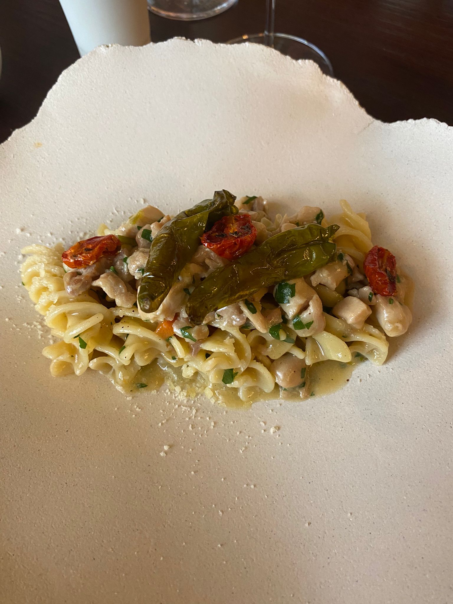 Straordinari i Fusilloni con ragù bianco di cortile e peperoncini verdi. Orto e aia, passato e futuro in un dialogo perfettamente riuscito. La carne di coniglio è tagliata rigorosamente a mano, spiega la chef, un omaggio al tempo lento che è sempre alla base dei piatti realizzati regola d’arte.