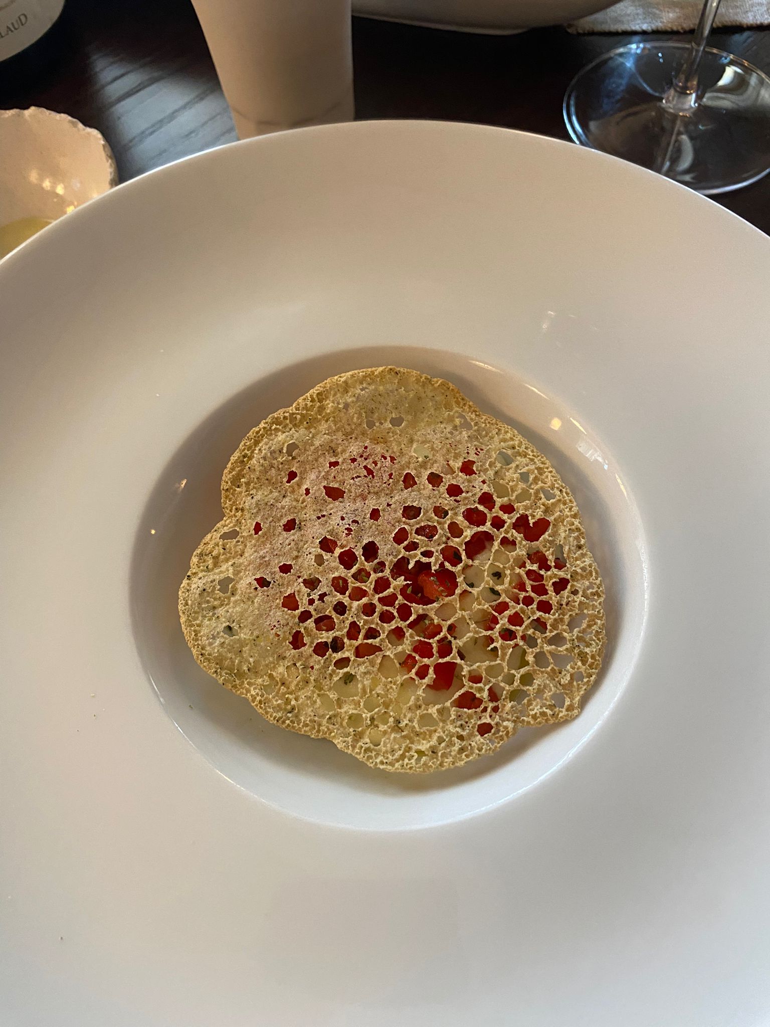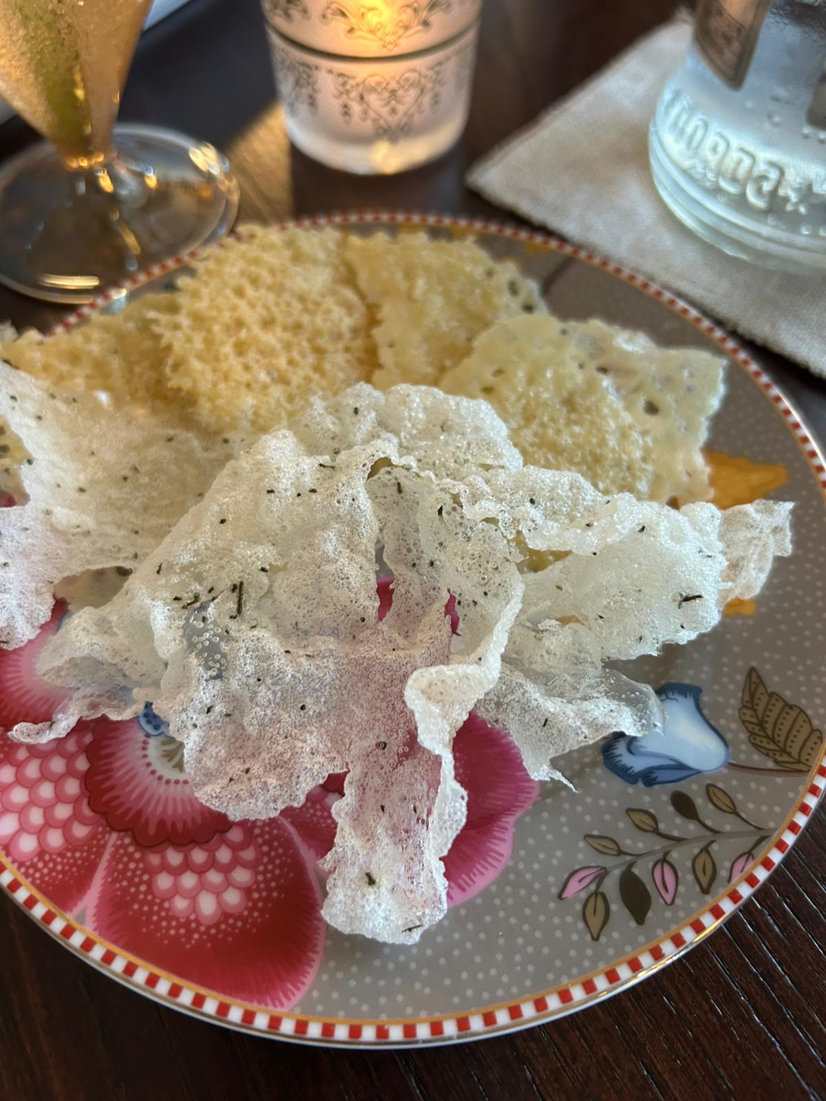 Si parte con la freschezza del gazpacho di pomodoro con primo sale di vacca jersey e erbette dell’orto. Ad accompagnare, il pane di grano arso da gustare con l’olio dell’azienda Iumara e le cialde di caciocavallo.