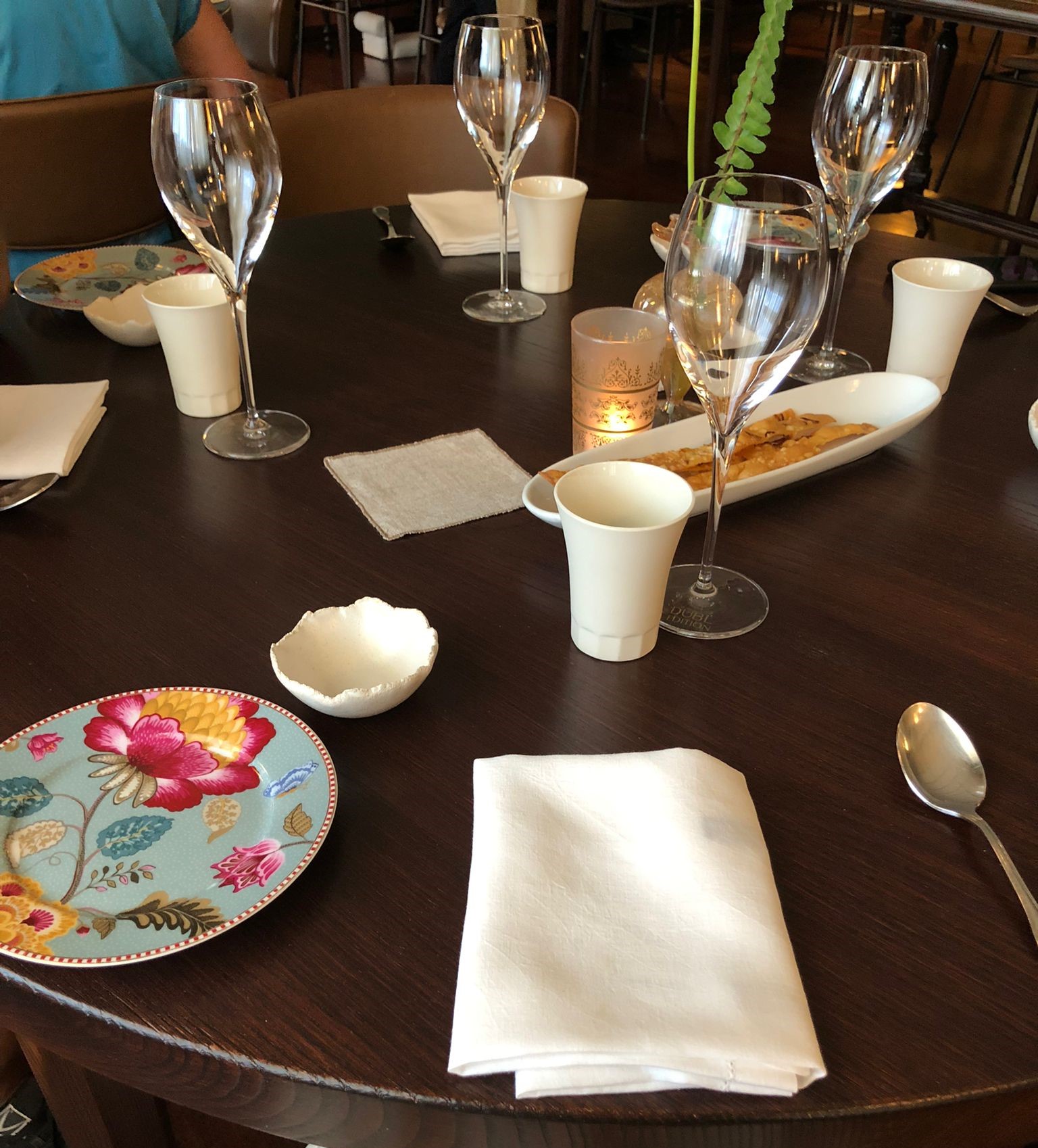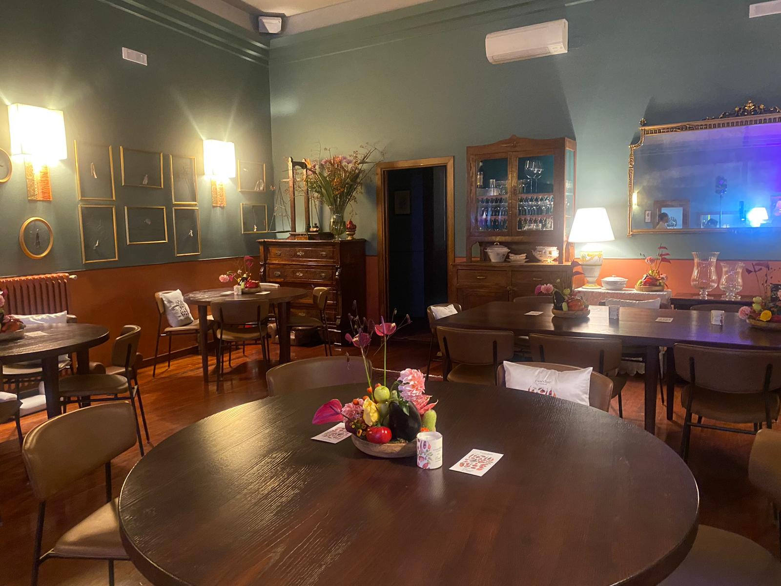 Anche la mise en place è in linea con le buone pratiche: da un po’di anni sono stati aboliti i tovagliati per ridurre gli sprechi sia di detersivi che di energia. Il rigore della scelta è attenuato dall’uso di piatti, bicchieri, posate di rara grazia ed eleganza che rimandano alle tavole delle occasioni speciali. I graziosi motivi floreali, il filo di oro zecchino come si usava una volta, le zuppiere antiche, i tovaglioli di finissimo lino ingentiliti da ricami realizzati rigorosamente a mano, i centro tavola discreti dove protagonisti sono i fiori di stagione appena raccolti, portano la firma di Raffaella Toto, responsabile degli eventi sia interni che esterni, la cui grande professionalità è un altro (e alto) valore aggiunto per la famiglia Fischetti.