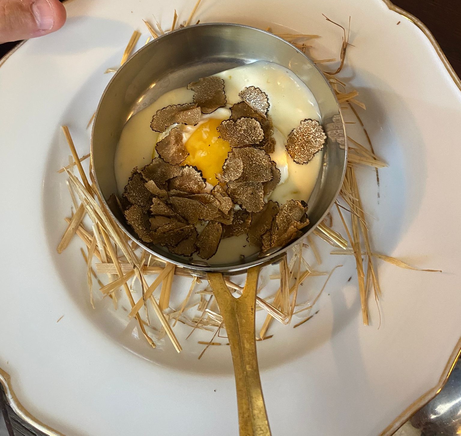 L’uovo di gallina ruspante con patate, limone e tartufo irpino è un grande classico del ristorante, a variare secondo la stagione è solo il tartufo. La presentazione nel pentolino di rame con, alla base, la paglia parla di una cura dei particolari attenta e studiata.