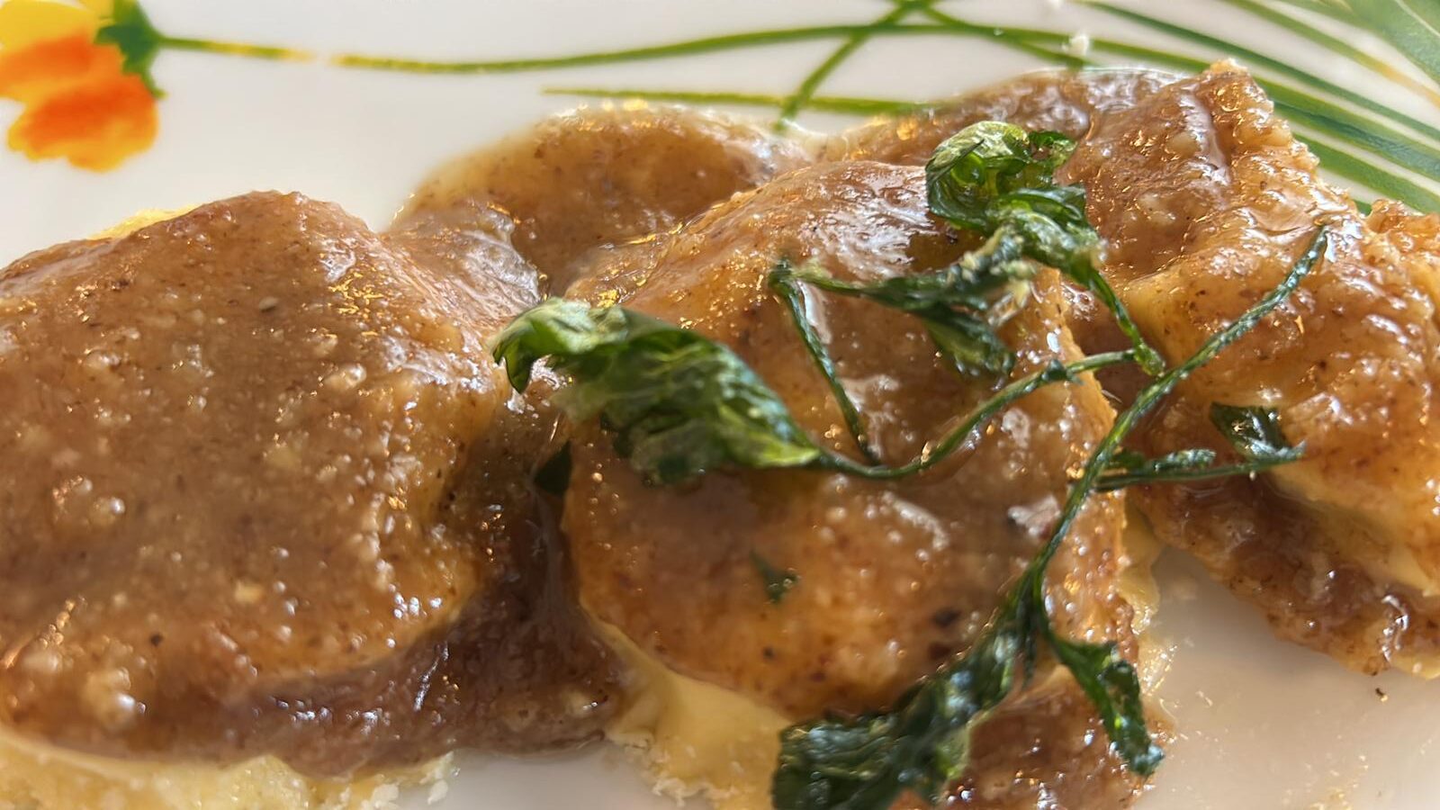 Oasis, ravioli con crema di noci e aglio bruciato