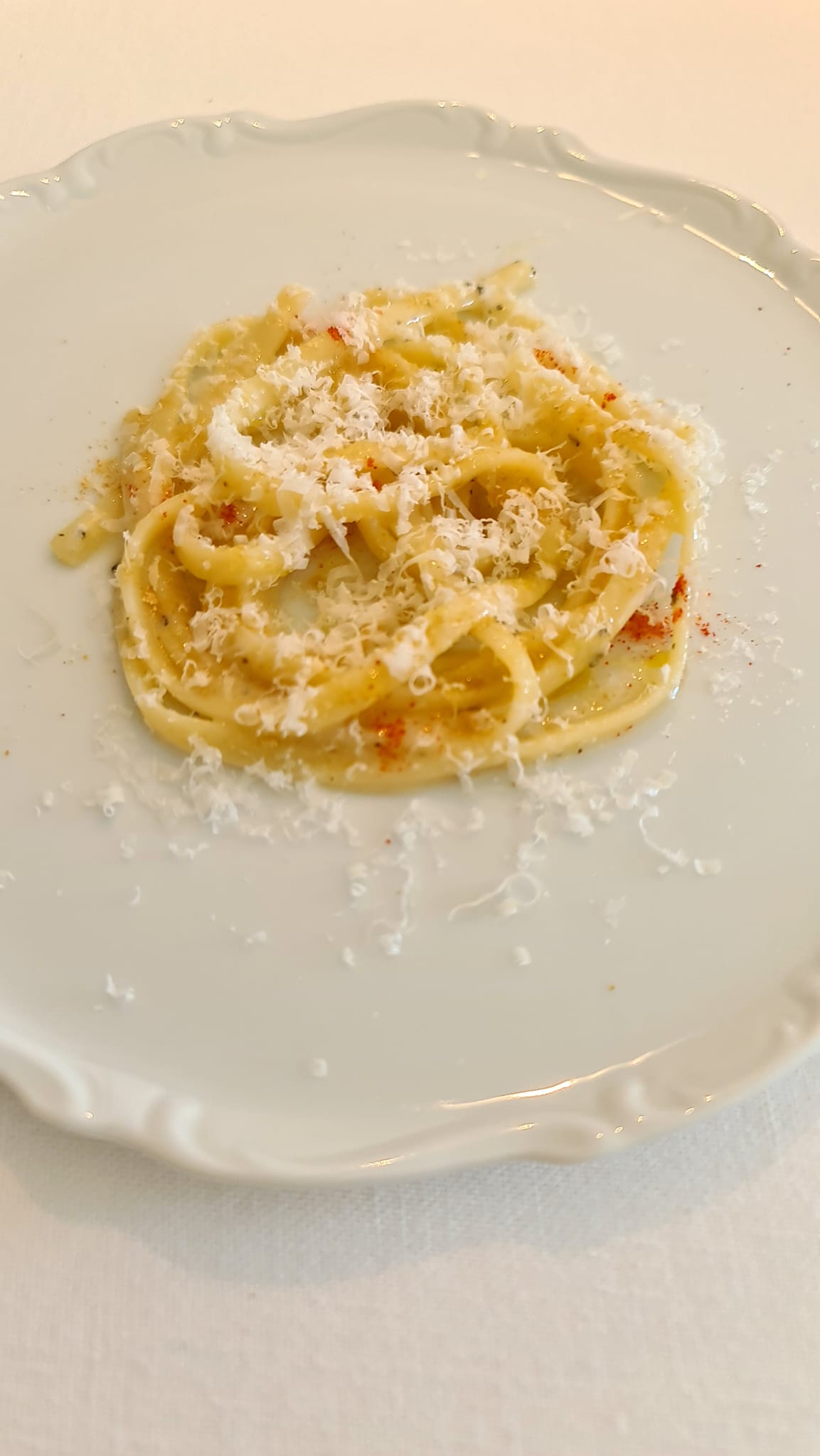 Linguine, limone, peperoncino e parmigiano è un pre dessert, perché la pasta è servita fredda, perché la pasta è un tapis roulant dove far scorrere acidità, un lieve piccante e la nota leggermente sapida del formaggio. Chiude fico, aceto e anice. Un pranzo in solitaria, come spesso mi capita con un viaggio di ritorno da affrontare, consiglia un percorso analcolico e devo dire che quello propostomi da Gianni Senesi era veramente centrato, pensato per accompagnare il percorso senza mai sovrastarlo, un piccolo lusso. Cristiana Romito padrona di casa impeccabile.