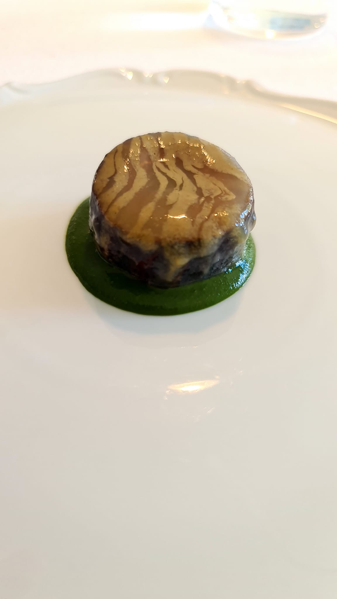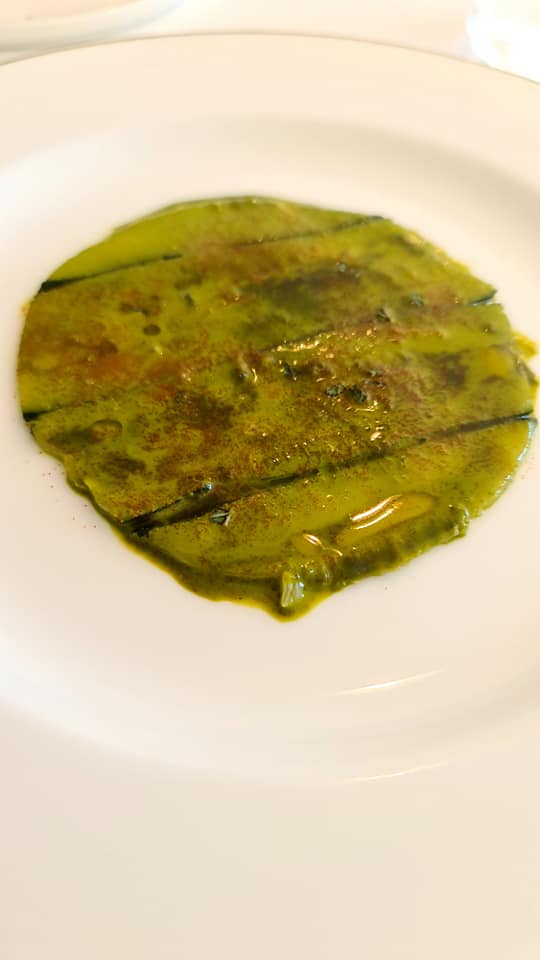 La carota, con un lavoro tecnico molto importante, è un inizio che ci racconta cosa mi riserverà questo pranzo. Il lavoro tecnico è notevole, il risultato palatale della carota è strabiliante. In effetti tanti sensazioni da una carota è difficile solo a pensarle. Con la zucchina comincia l’esplorazione del mondo degli amari, il vero leitmotiv di questo menu, che fanno il paio con la ricerca delle acidità.
