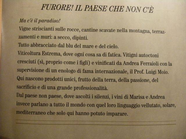 1. E pensare che ero convinto fino ad oggi che Andrea fosse solo il consorte di sua maestà Marisa:mi devo ricredere.Scherzi a parte il loro Fior D’uva è da considerarsi uno dei migliori bianchi d’Italia e a dirlo non è solo il sottoscritto,ma un vero e propio Furor di premi raccolti in giro per il mondo che dovrebbero inorgoglire ogni Salernitano.PS.A costo di ripetermi voglio ancora una volta ribadire che il loro ultimo rosso assaggiato più per mestiere che per convinzione l’ho trovato veramente interessante.FM.