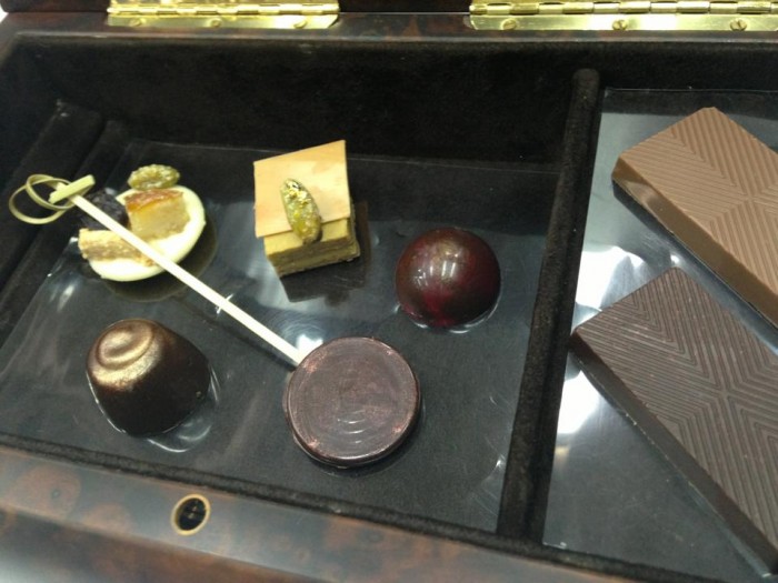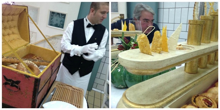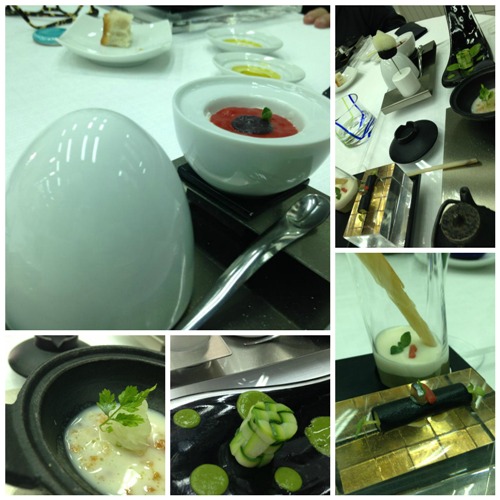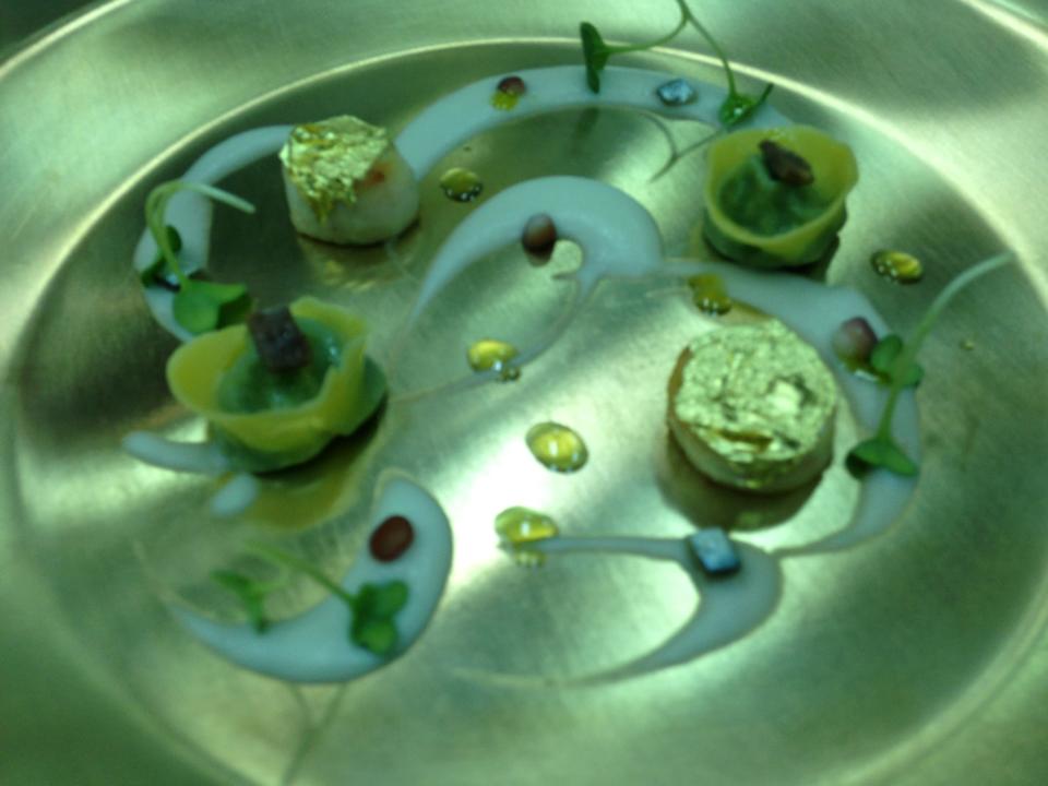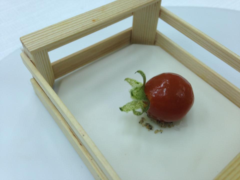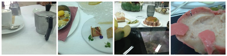Poi ogni piatto ha una sua narrazione, che non è la spiegazione di come è stato fatto, bensi lo svolgimento di un tema che prosegue anche a tavola, nel servizio, anch’esso pieno di simbolismo e allegorie, contenitori studiati per la bisogna che spesso ricordano l’oggettistica infantile rassicurante come le piccole vetrine della petit patisserie o i portapane.