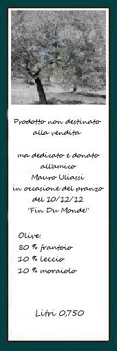 Spiazzato, rifletto su alcuni nomi. Poi ne faccio, dopo suggerimento e consulto telefonico col produttore oleario Ciomei. Piacciono. Igles Corelli e Mauro Uliassi saranno dei nostri. Cinque telefonate le avevo già chiuse, più i due chef e siamo arrivati. Due saltano. Pazienza, sarà per l’anno prossimo. Anzi no, c’è la fine del mondo, cribbio! E l’olio santo di Ciomei ha la dedica, infatti: in occasione del pranzo del 10/12/12 “FIN DU MONDE”. Poi a uno, e ci sono anche affezionato, non piacciono le “feste dell’Unità”, che per lui sono più di tre persone. Mi ha già detto no un paio di volte quest’anno e per i miei gusti il terzo diniego non me lo faccio dire nemmeno da miss Mondo o dallo scrittore più bravo d’Europa.