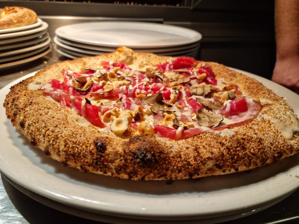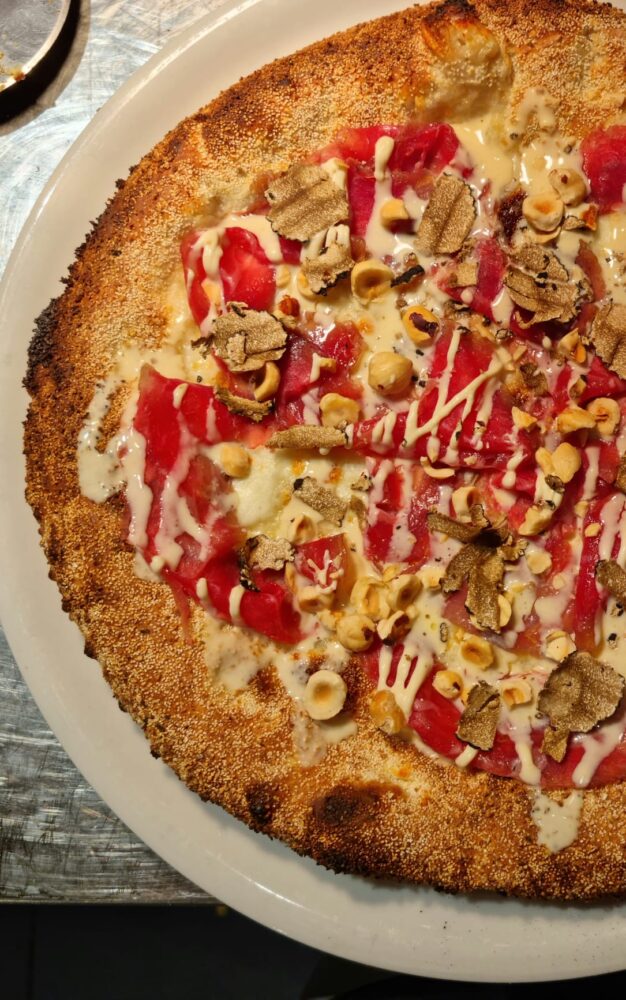 Le pizze, firmate da Ignazio Barcella, si dividono in due sezioni: tradizionali e contemporanee. E a proposito di contemporanee, nel menù è presente anche una pizza nata dall’incontro tra il pizzaiolo e lo chef. Il suo nome è duetto: sulla base di fior di latte, viene adagiato un carpaccio di manzo salagionato, una fonduta di Normanno, nocciole tostate e infine scaglie di tartufo. In abbinato, il sommelier ha proposto una bollicina firmata De Bartoli. Qui ci spostiamo nelle zone di Marsala, si tratta di uno spumante (metodo classico Brut) che ben si sposa con la sapidità della pizza in questione.