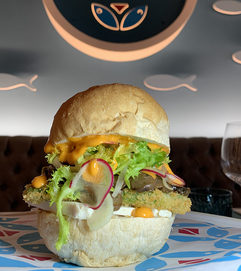 Comporre il panino inserendo in quest’ordine: una fetta di tofu, i funghi, la cotoletta di avocado, i finocchi alla marinara, la scarola riccia (precedentemente condita ed unita ai ravanelli), sale maldon, olio extravergine di oliva e buccia di lime. Completare il tutto con la maionese di pomodoro montata.