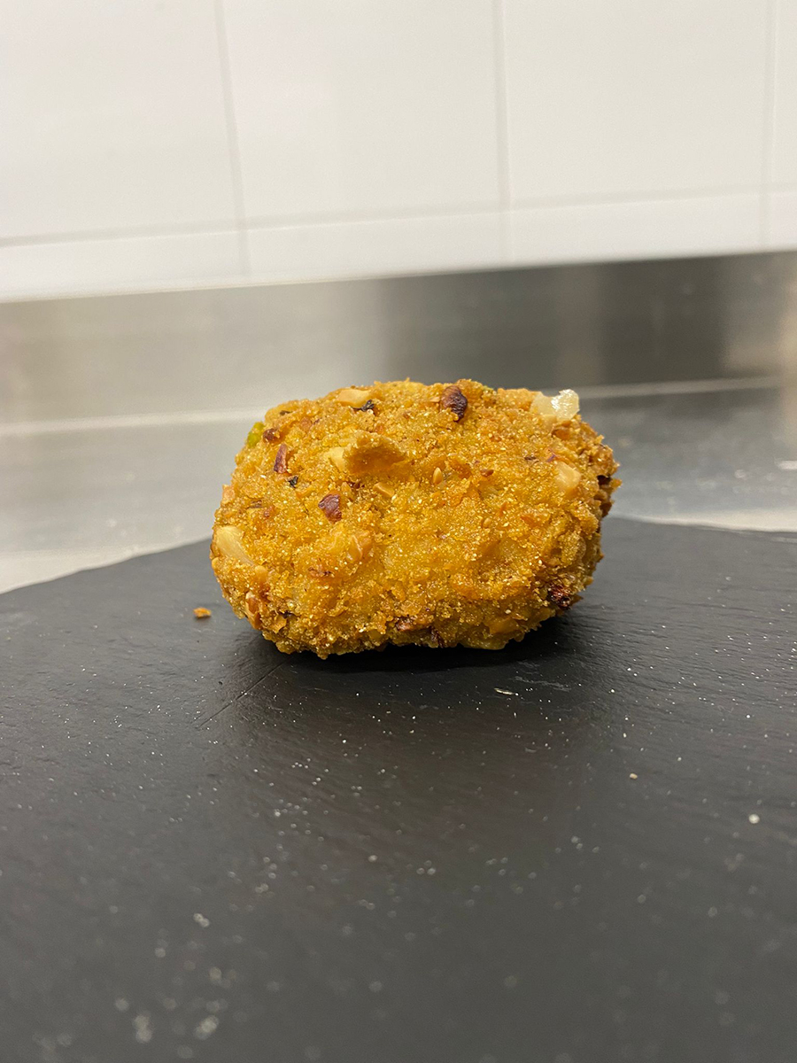 Nel frattempo, in un contenitore, miscelare la farina con acqua e un pizzico di sale. Immergere le frittatine nella pastella ed impanarle con il mix di corn flakes e frutta secca. Friggere in olio caldo a 180 °C.