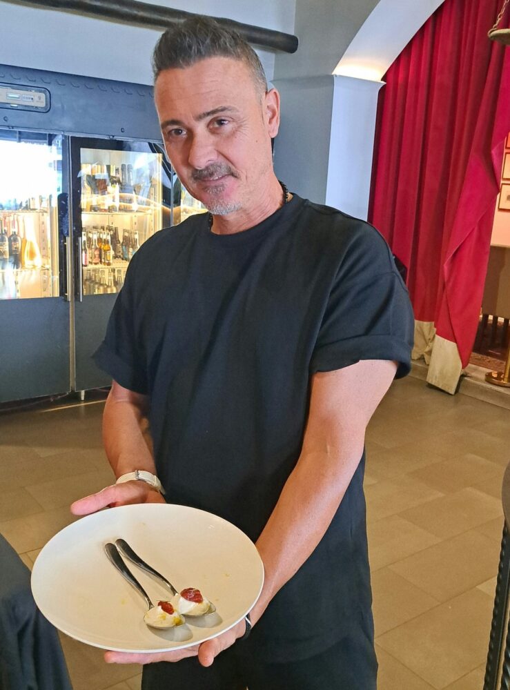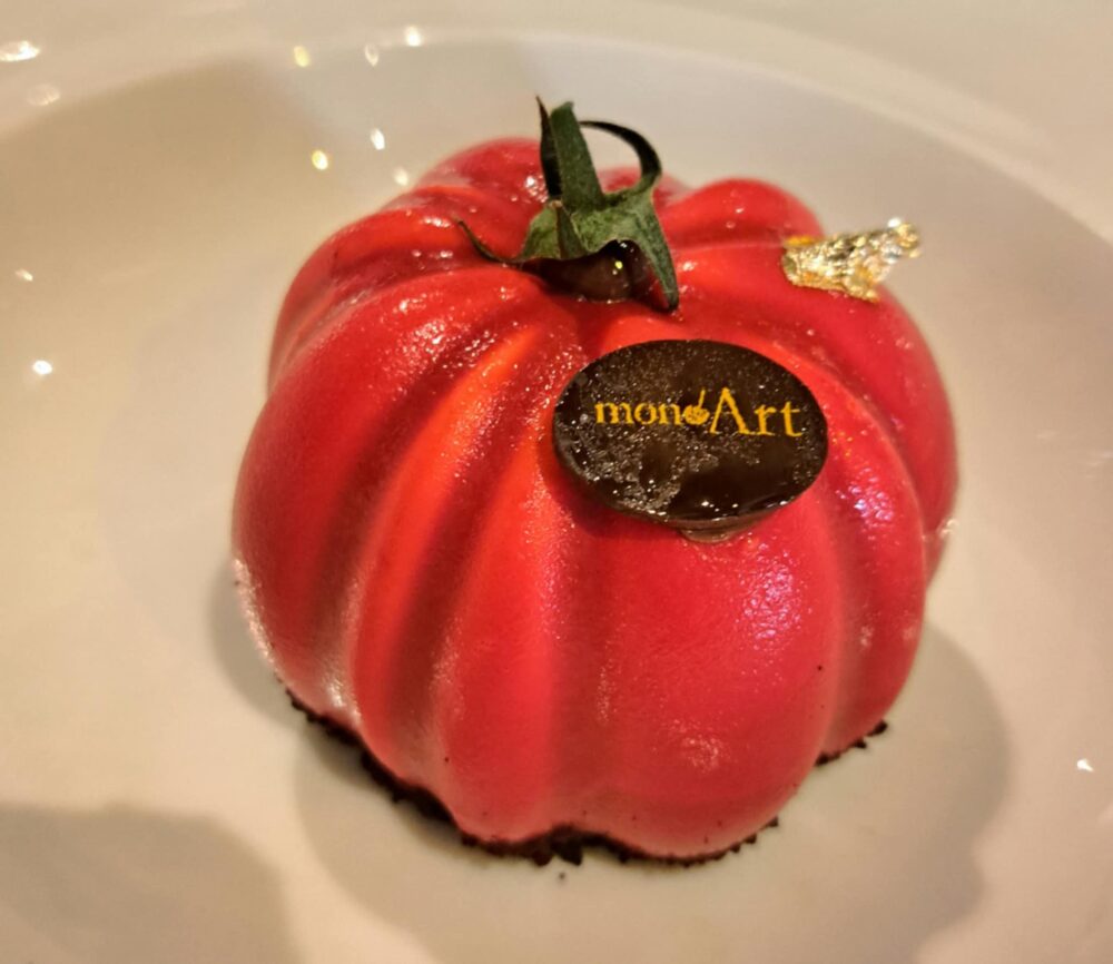 Gran finale con un’autentica opera d’arte dolciaria: il “Dolce Pomodoro” firmato mon Art, una composizione audace di cheesecake allo yogurt greco, gelée di ciliegia, ganache alle spezie e cake alla nocciola, che ha lasciato tutti senza parole.