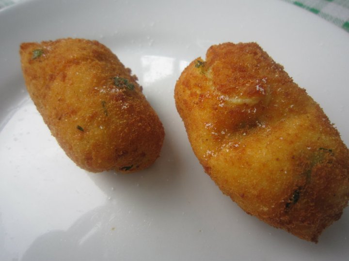 Nell’attesa arrivano sulle tavole fumanti crocchè di patate, di quelli veri, non tutti uguali, frittura perfetta, crosticina croccante un po’ staccata dalla farcia e dentro profumata provola filante, prosciutto cotto, sale e pepe.