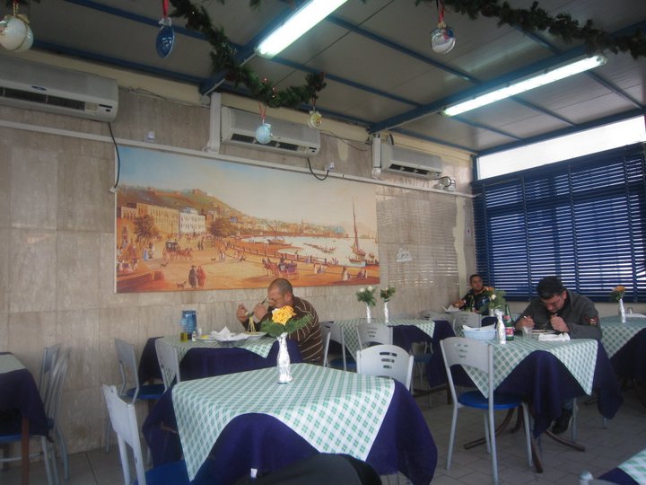 Il locale è semplicissimo, quasi una struttura mobile con infissi in pvc e tapparelle blu. Un’unica sala con circa 15 tavoli, arredamento essenziale, ad una delle pareti spicca una riproduzione della tavola Strozzi di via Caracciolo fin de siècle.