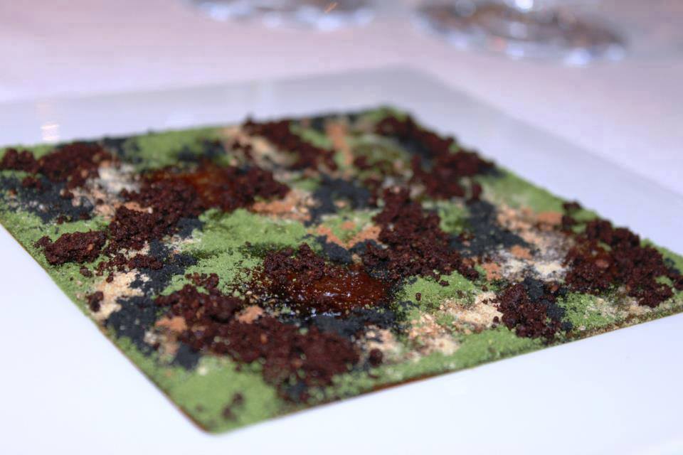 Un dolce celebrale, dove ogni cucchiaio è diverso dall’altro. Lepre marinata, foie gras, cacao, erbe essiccate e polverizzate, sale alla vaniglia, porcini grigliati disidratati e resi polvere, piccole briciole di biscotti al caffè e cioccolato, cenere di verdura, sedano rapa e alghe, tartufo bianco disidratato sotto zero e forse ho dimenticato anche qualcosa. Provare questo piatto vi metterà in difficoltà a scegliere il dolce al ristorante, qualunque cosa scegliate e dovunque siate, non sarà mai come questo dolce. Genialità indiscussa.