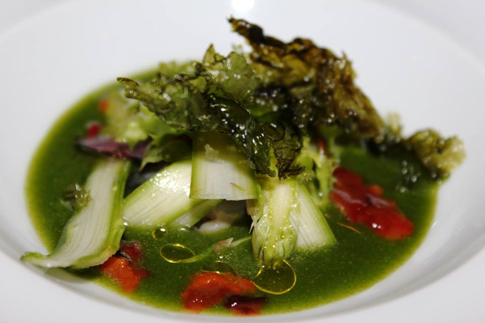 Centrifugato di asparagi e borragine con ostrica e ricci di mare, Gennaro Esposito, Torre del Saracino