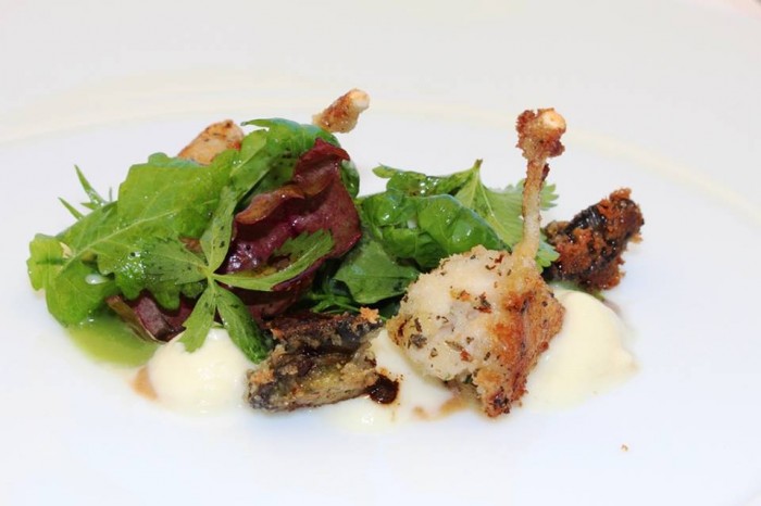 Misto di erbe selvatiche, crema di bucce di fave, purea di patate, lumache e coscette di rana, crumble di nocciole. Tutto quello che elegante non è, compreso il nome, in questo piatto si trasforma e diventa di una eleganza quasi imbarazzante. Piatto meraviglioso, in cui mauro dimostra di essere uno dei Re Mida della cucina italiana. Eleganza estrema.