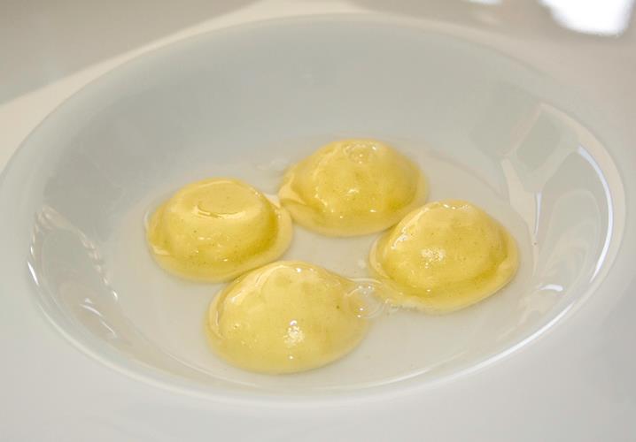 Nei tortelli ripieni di ricotta di bufala, Il liquido di governo della mozzarella, addensato con amido di riso, è utilizzato per cuocere il tortello. Un brodo leggermente denso con una nota vegetale data dai capperi, dissalati e centrifugati. L’acqua di pepe, realizzata mettendo i grani in infusione, completa la preparazione di Niko. Un concentrato di bufala, le note dei capperi e del pepe allungano infinitamente il piacere. Concentrato di sapori.