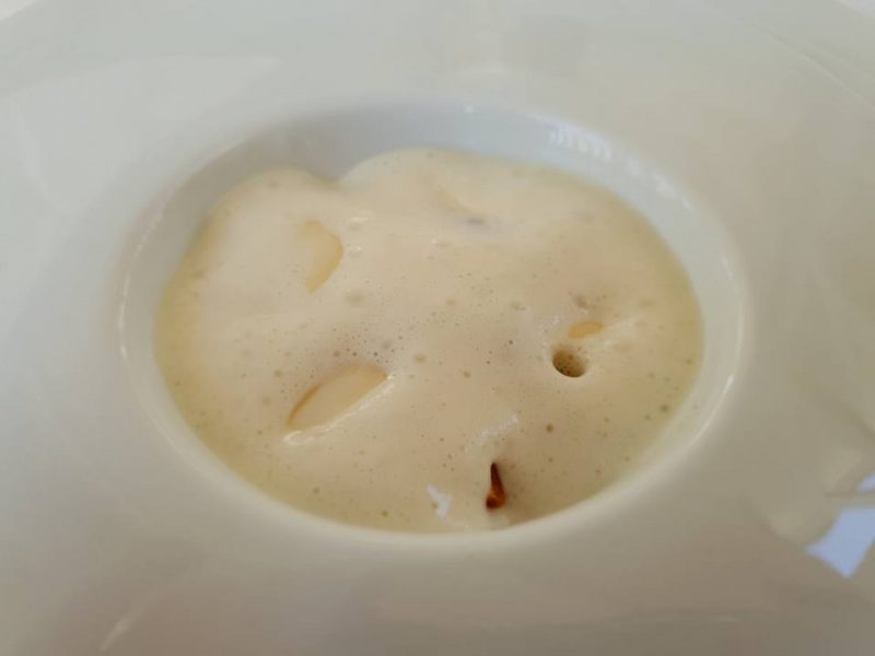 Pancotto, ricci di mare e mandorle. Mauro Uliassi, Uliassi, Senigallia. Un piatto di recupero della tradizione contadina il pancotto, vero paracadute della nonne per non buttare via niente. Infatti il pane raffermo rimasto, veniva bagnato, a seconda del periodo e della disponibilità economica, con il brodo di carne o del pesce, ma anche semplicemnte con l’acqua e poi si aggiungeva quello che c’era, La mia nonna me lo preparava sempre. In questa versione di Mauro assume una prospettiva quasi onirica e psichedelica. Il lavoro sulle mandorle in consistenze diverse e il pancotto sono la base del piatto, i ricci ghiacciati sono una ventata di iodio irruenta. Provando il piatto, si apre una finestra di ricordi e di emozioni. Il gusto è rassicurante, per poi diventare improvvisamente violento in un continuo rincorrersi di sensazioni che a volte sono carezze, a volte sono come un gancio destro di un peso massimo, ben assestato sotto il mento. Da mangiare ascoltando la psichedelia dei Pink Floyd e della loro canzone forse più bella Shine On You Crazy Diamond, copolavoro assoluto, come il piatto di Re Mauro.