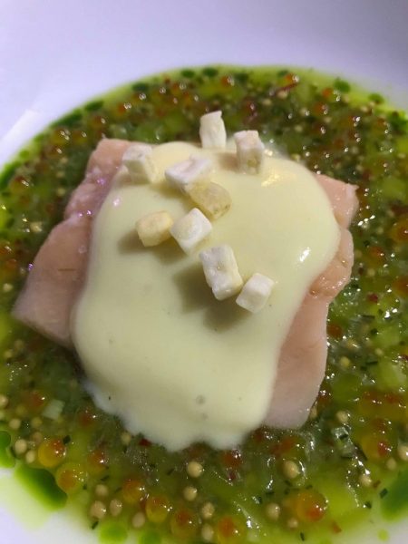 Trota, vinaigrette al cetriolo con caviale di trota, senape e spuma di patate. Sven Elverfeld, Aqua, Wolfsburg. Fantastica la trota di Sven, le note vegetali fanno da contraltare alla proteina in un lungo susseguirsi di sensazioni mutevoli al palato. Per questo abbinamento scomodiamo i mitici “Fab Four” ovvero i Beatles e la loro Eleanor Rigby, tratta dall’album Revolver. Pop e musica classica, un’orchestra di otto elementi (ottetto) formata da quattro violini, due viole e due violoncelli accompagna la voce solista di Paul e i cori, che si rincorrono facendo da contraltare l’uno all’altro. Due gocce d’acqua nel pensiero, con il piatto di Sven.