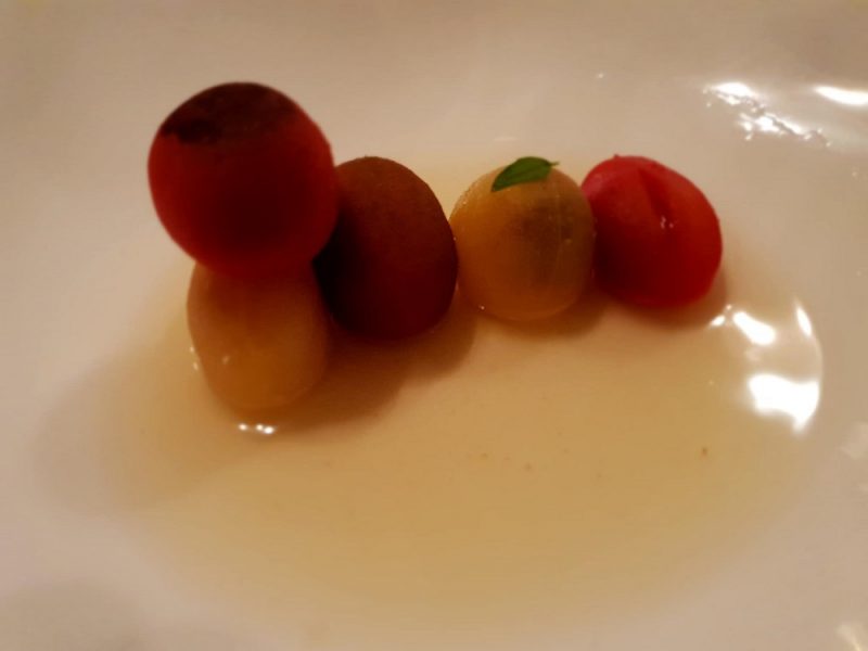 Il piatto dei pomodori di Josean Alija è stato il primo piatto servito al Nerua all’interno del Guggenheim Museum di Bilbao. Un piatto che il cuoco basco non riesce a togliere dalla carta, perchè i suoi clienti lo chiedono sempre. Semplicemente l’inizio perfetto per qualsiasi pranzo. Dolcezza, acidità, note aromatiche intense e continue, leggerezza. La salivazione ai massimi livelli. Inizio perfetto. Ci sono tante sensazioni racchiuse in questo piatto, tecnica, materia e pensieri intelligenti, da mangiare ascoltando Bohemian Rhapsody dei Queen. Tutto e il contrario di tutto per la canzone, dalla particolare struttura musicale, composta da cinque diverse parti principali: un’introduzione corale cantata a cappella, un segmento in stile ballata che termina con un assolo di chitarra, un passaggio d’opera, una sezione di hard rock e un altro segmento in stile ballata che conclude su una sezione solo piano e chitarra. Tutto e il contrario di tutto per il piatto di Josean.