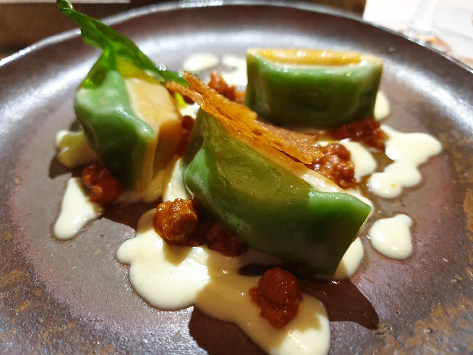 Ovo by Carlo Cracco, come una lasagna. Mosca Russia. Emanuele Pollini, romagnolo ed executive chef del ristorante Ovo firmato Carlo Cracco, è un vero fuoriclasse. A Mosca riesce a fare una cucina italiana creativa, senza essere caricaturale, senza scendere a compromessi. Come una lasagna, sono dei tortelli realizzati con gli ingredianti della lasagna, uno dei piatti più buoni e golosi che ho provato quest’anno, da mangiarne a chili. Suadenti e setosi, lo chef romagnolo riesce nel difficilissimo compito di mettere in risalto solo gli elementi principali del piatto. Abbinamento con Blue in Green di Miles Davis, che suonava solo le note principali per farle risaltare.